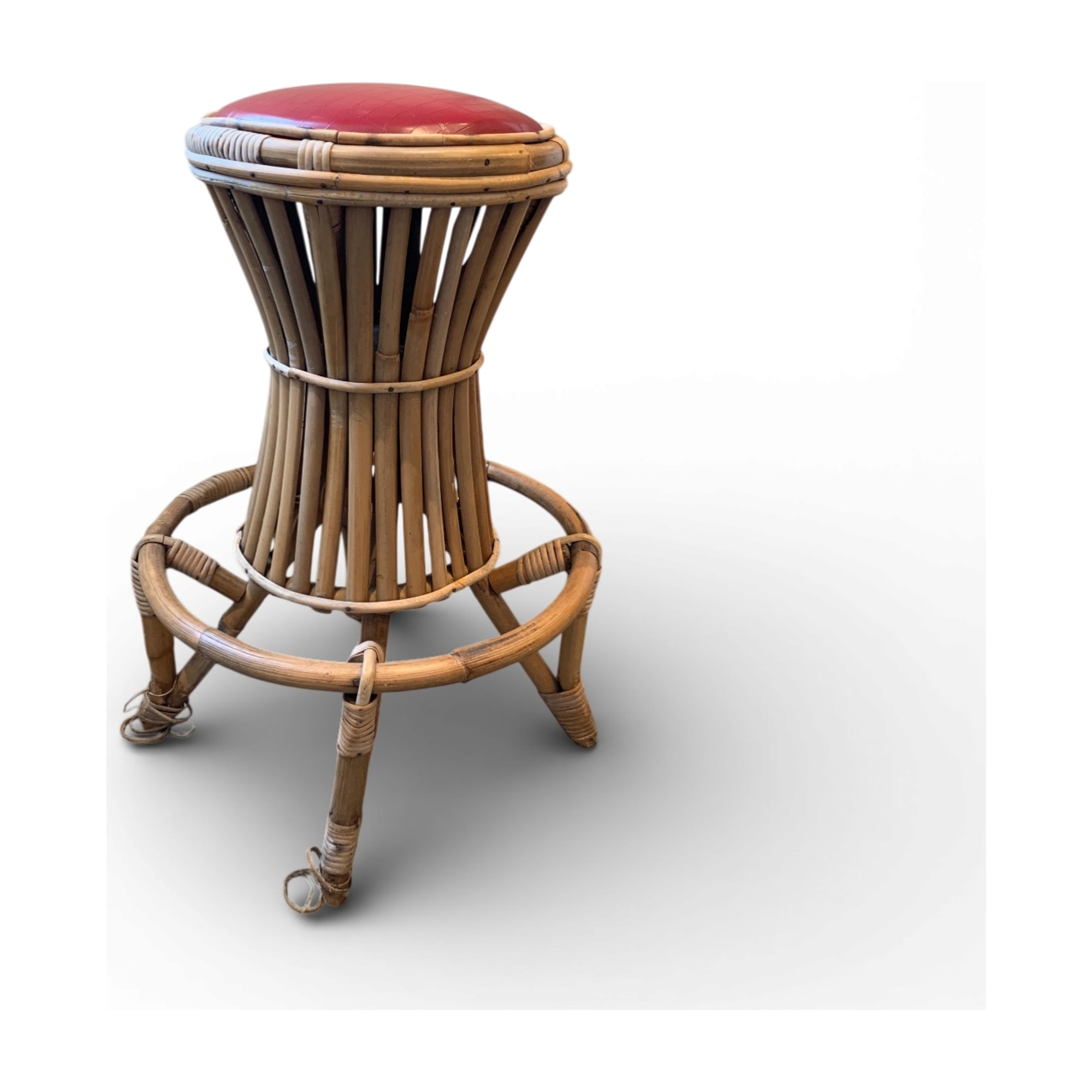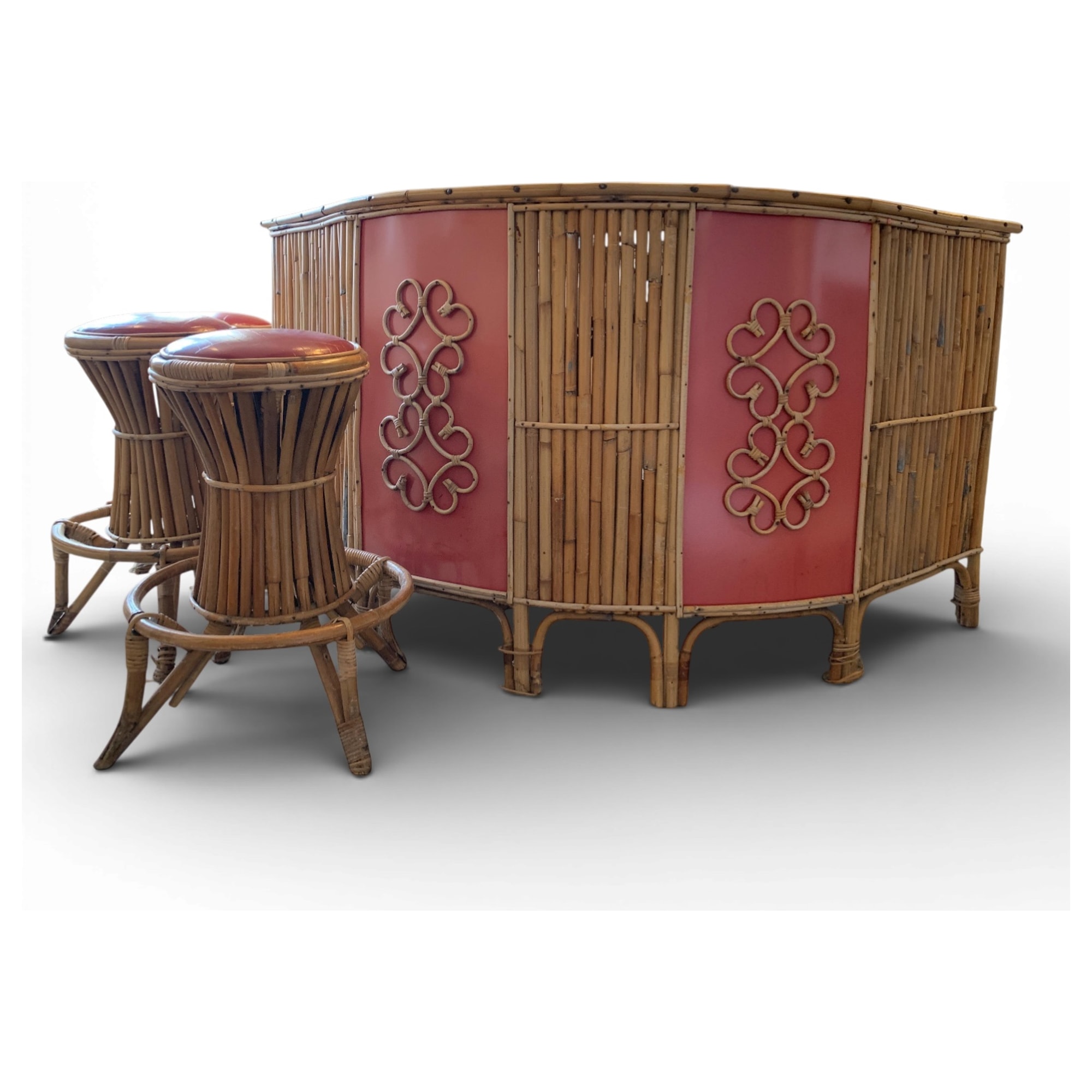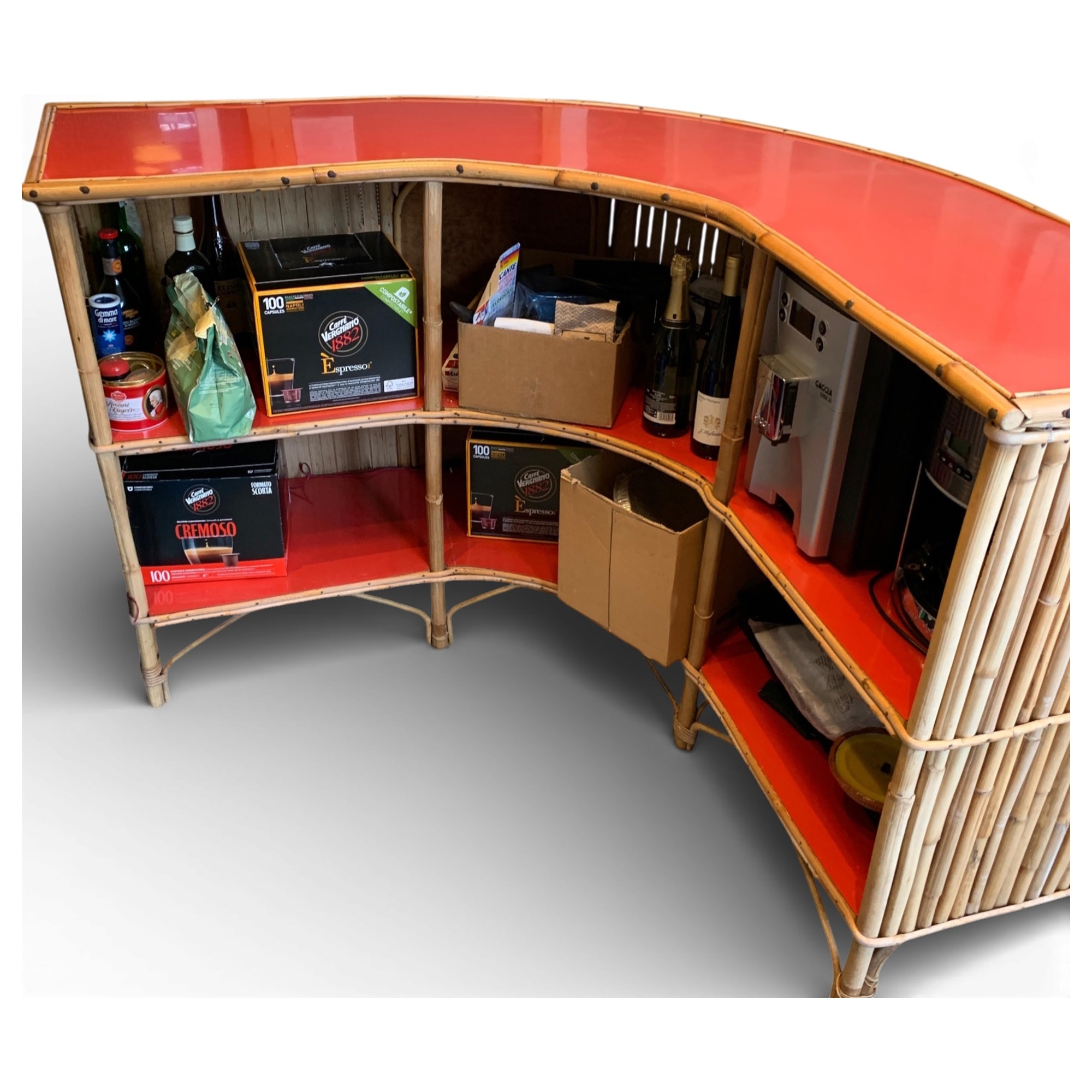 Questo angolo bar anni '50 in bambù e skai corallo era spesso il cuore delle terrazze borghesi in Riviera. La lavorazione del bambù, con le sue volute a motivi ornamentali, richiama l'artigianato esotico importato in Italia dopo la seconda guerra mondiale, quando il materiale divenne simbolo di evasione. Le superfici interne sono laccate tono su tono, dettaglio raro che proteggeva contro le macchie dei cocktail accesi allora in voga.