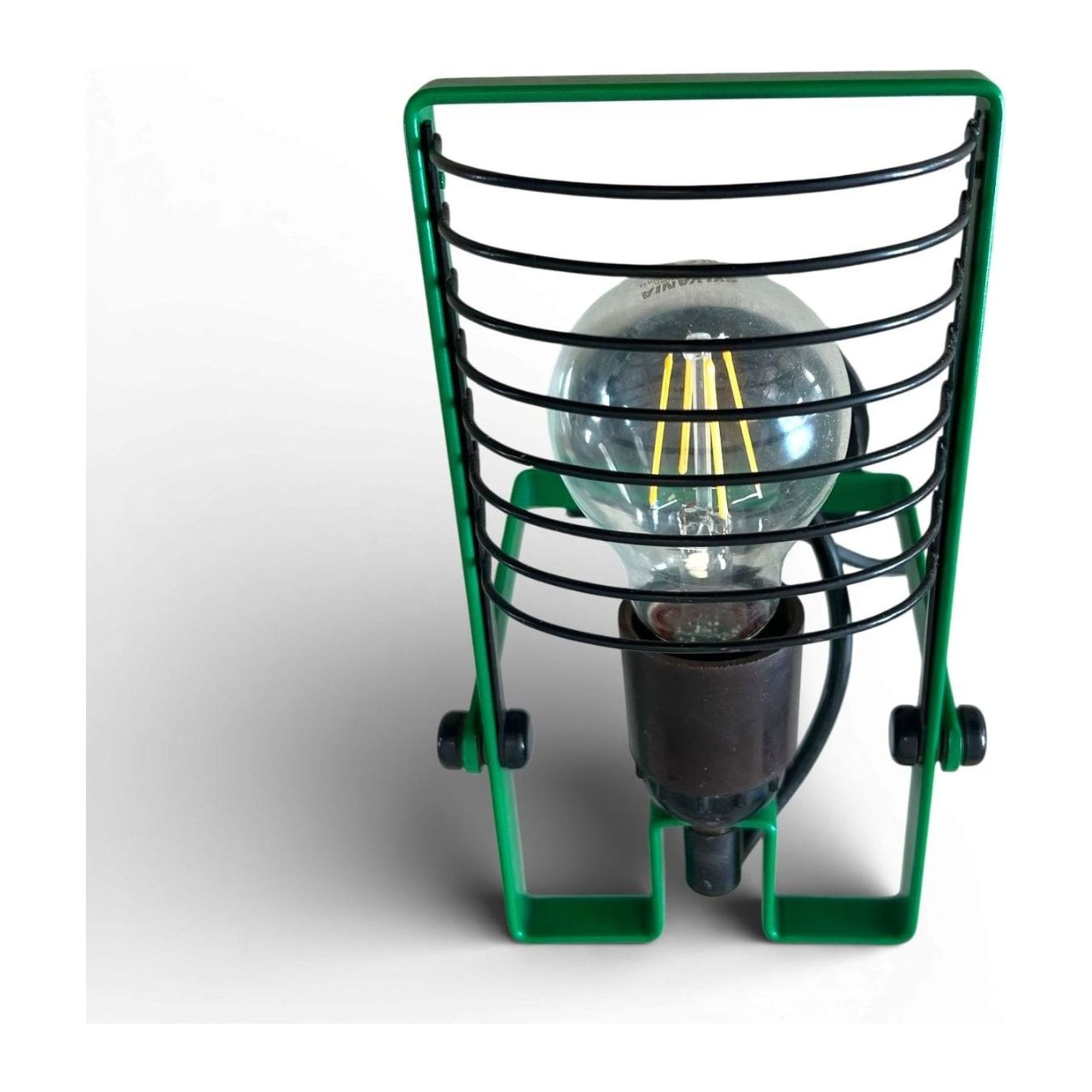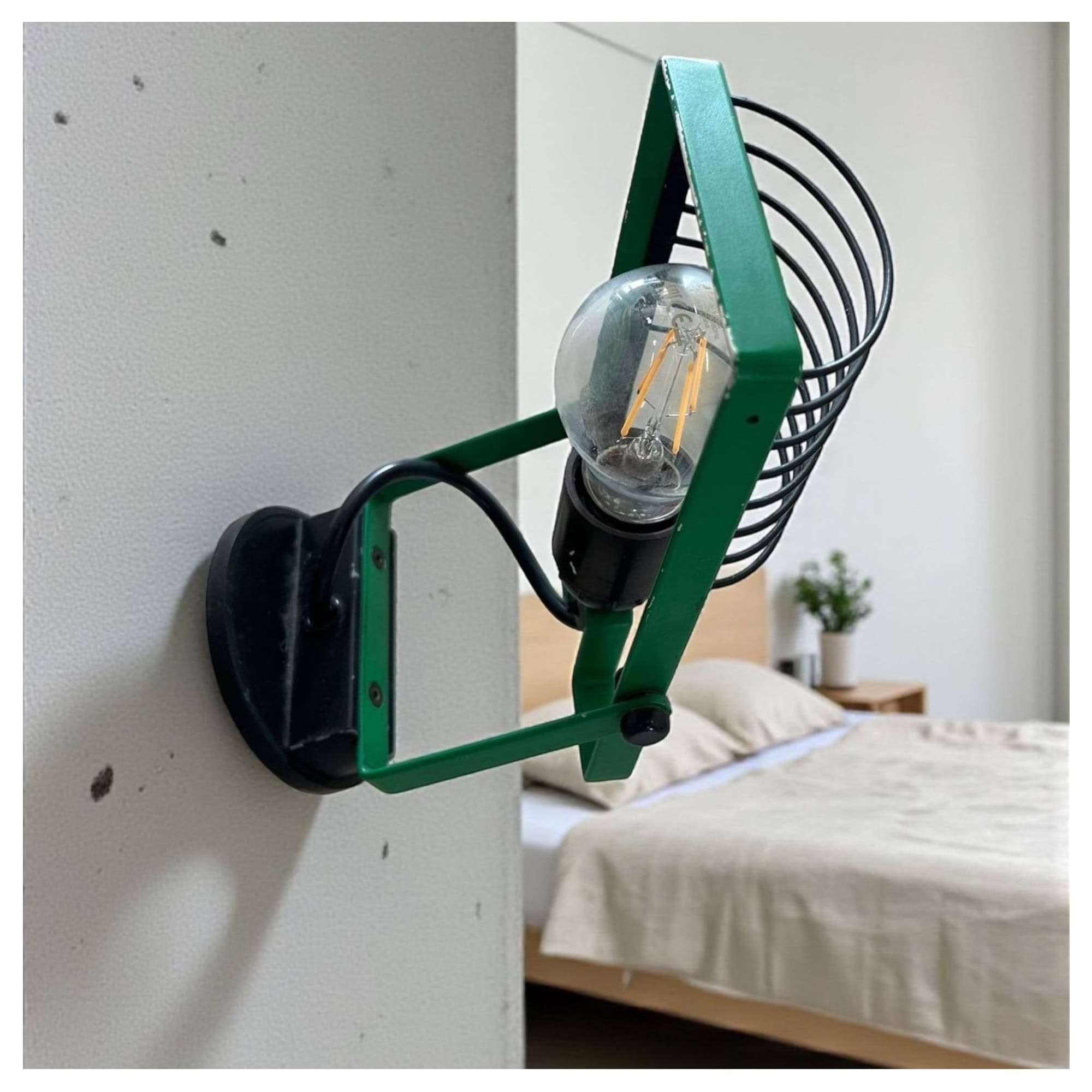 Rara applique da parete di produzione artemide: la struttura in metallo verniciato verde racchiude la lampadina con una sorprendente griglia nera, creando un gioco di luci inaspettato sulla parete. Il dettaglio che la rende unica è la regolazione laterale ad asse rotante, tipica dei progetti italiani degli anni '70 votati alla funzionalità industriale. Questo pezzo riflette la tendenza dell'epoca verso materiali semplici reinterpretati con spirito sperimentale.