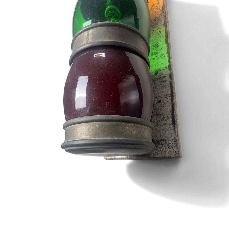 Suggestiva applique industriale risalente agli anni '50, caratterizzata da una struttura in robusto metallo patinato abbinato a quattro elementi in vetro colorato bianco, arancione, verde e rosso scuro. Il design verticale, scandito dagli anelli metallici e dai volumi pieni dei vetri, conferisce all'oggetto una qualità scultorea di forte presenza visiva, ideale per interni dal sapore vintage o industriale.