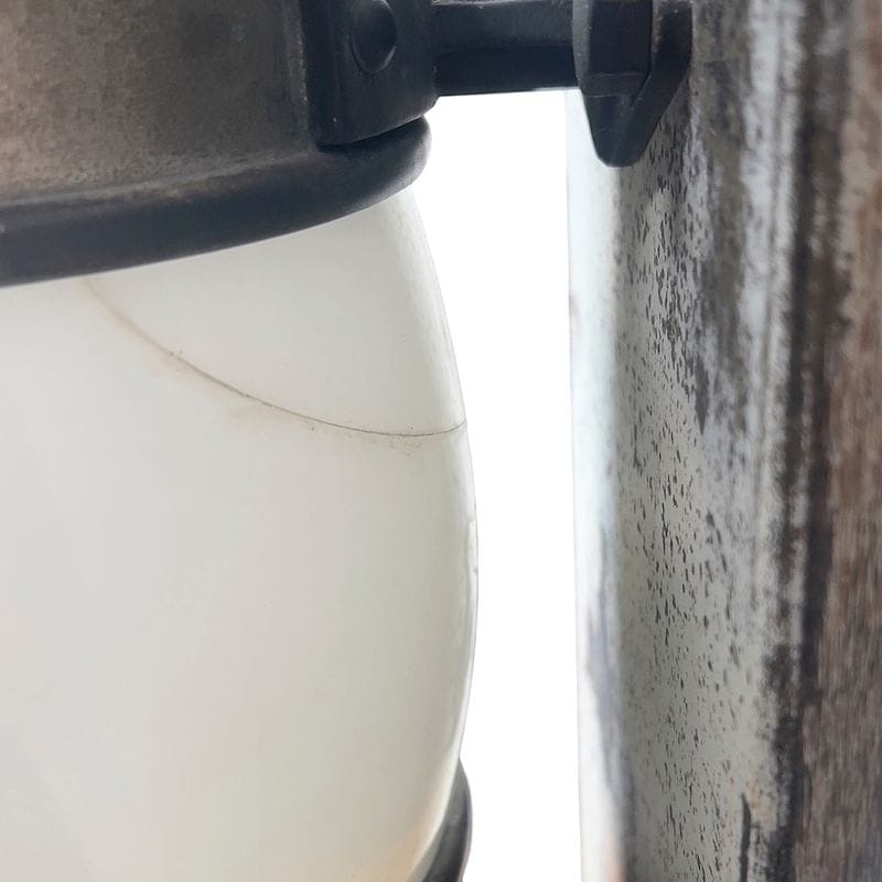 - buono, visibile patina del tempo; leggere tracce di ruggine e ossidazione sul metallo; un vetro presenta una crepa superficiale; l'insieme mantiene una presenza autentica e d'impatto