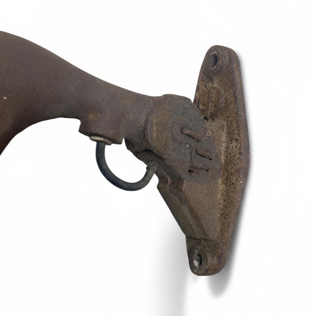 Striking applique industriale da esterno, realizzata interamente in ferro brunito, si distingue per la sua forma funzionale e il carattere autenticamente vintage. Il corpo illuminante, segnato da una naturale ossidazione della superficie, trasmette tutto il fascino dell’arredo urbano e industriale del primo Novecento. L'ampio riflettore metallico, abbinato alla solida staffa di fissaggio murale, testimonia lavorazioni solide e materiali resistenti, pensati per un uso esterno durevole nel tempo. Dettaglio estetico di rilievo, la patina originale conferisce unicità e autenticità a questo elemento d’arredo, rendendolo ideale sia per arricchire contesti loft o terrazzi in stile industriale, sia come accento dal sapore retrò in spazi residenziali contemporanei che desiderano evocare atmosfere urbane d’epoca.