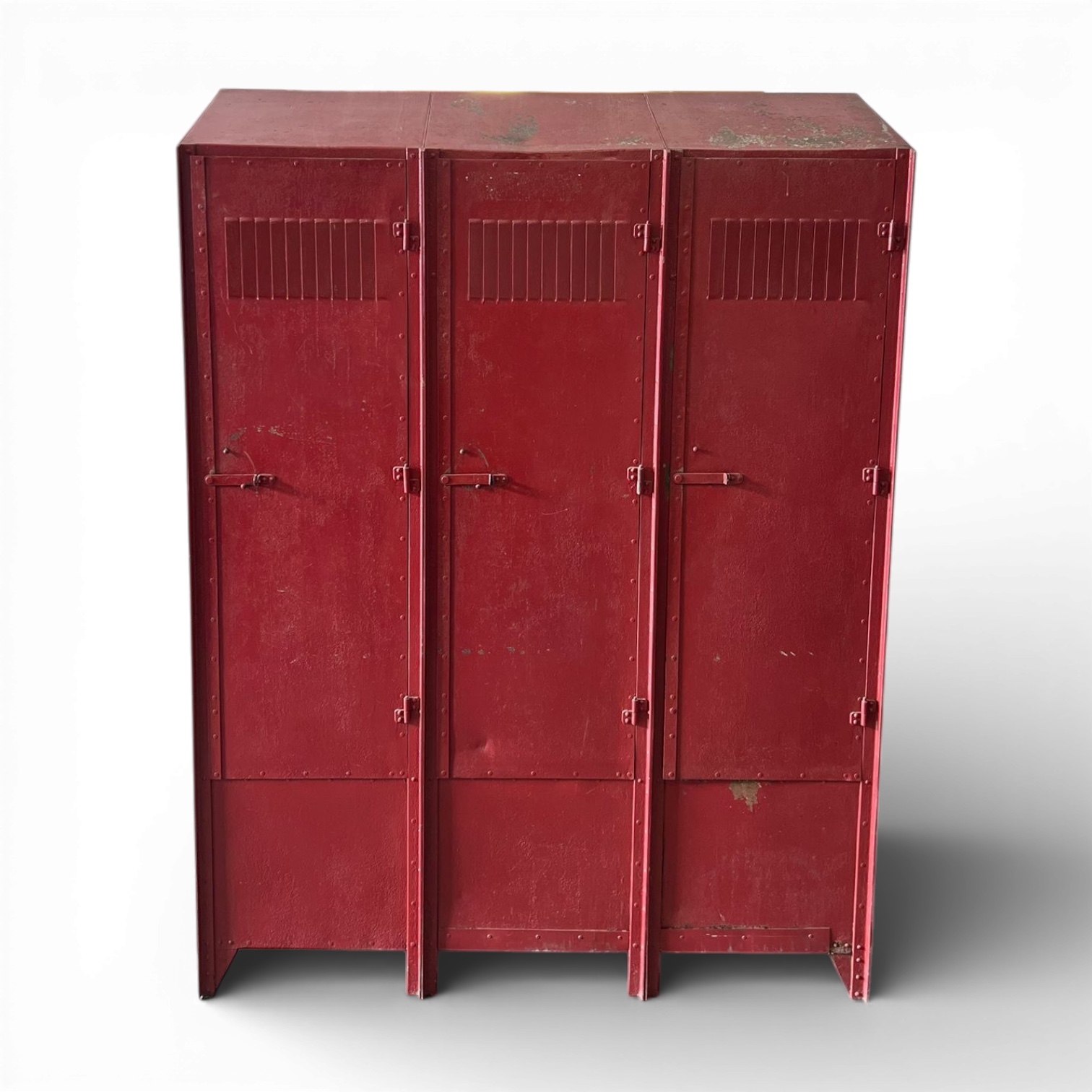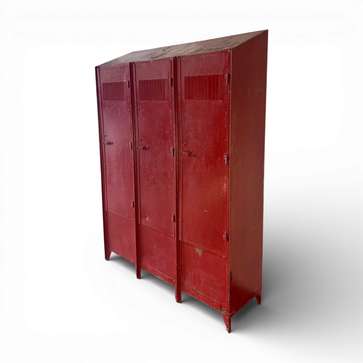 Raro armadietto industriale a tre vani degli anni '50 in lamiera verniciata di rosso, utilizzato originariamente in fabbriche o officine. Da notare le feritoie superiori d’aerazione ottenute per stampaggio, ancora perfettamente funzionali. Il colore vivido è frutto di una verniciatura a fuoco tipica dell’epoca, scelta per la sua resistenza agli ambienti ostili. Il sistema di chiusura, essenziale e robusto, tradisce la destinazione utilitaria ma rivela il fascino autentico dell’arredo industriale italiano.