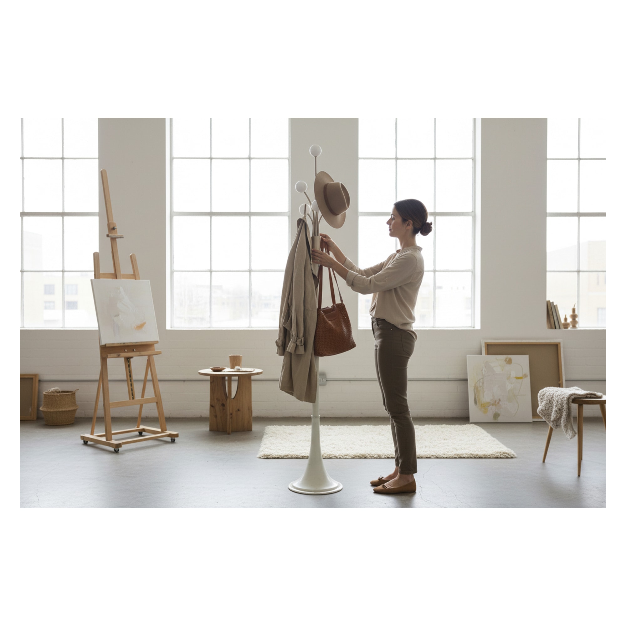 Interessante attaccapanni da terra ispirato alla forma organica dei rami, tipico della produzione italiana degli anni '60. Un dettaglio insolito: le sfere terminali in plastica sono pensate per non segnare i cappotti, una soluzione all’epoca ancora poco diffusa. Le curve dinamiche dei bracci richiamano i motivi molecolari delle avanguardie scientifiche del dopoguerra. Oggetto raro che fonde funzione e spirito sperimentale dell’epoca.