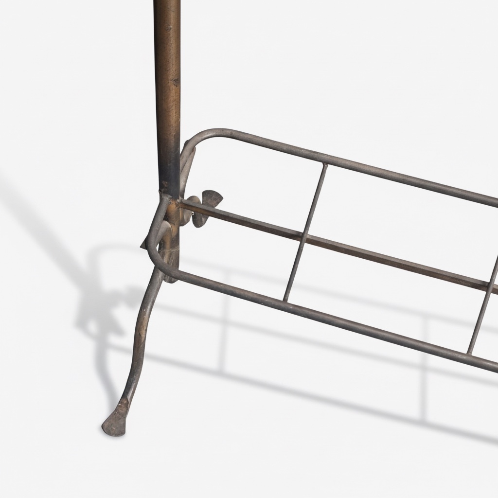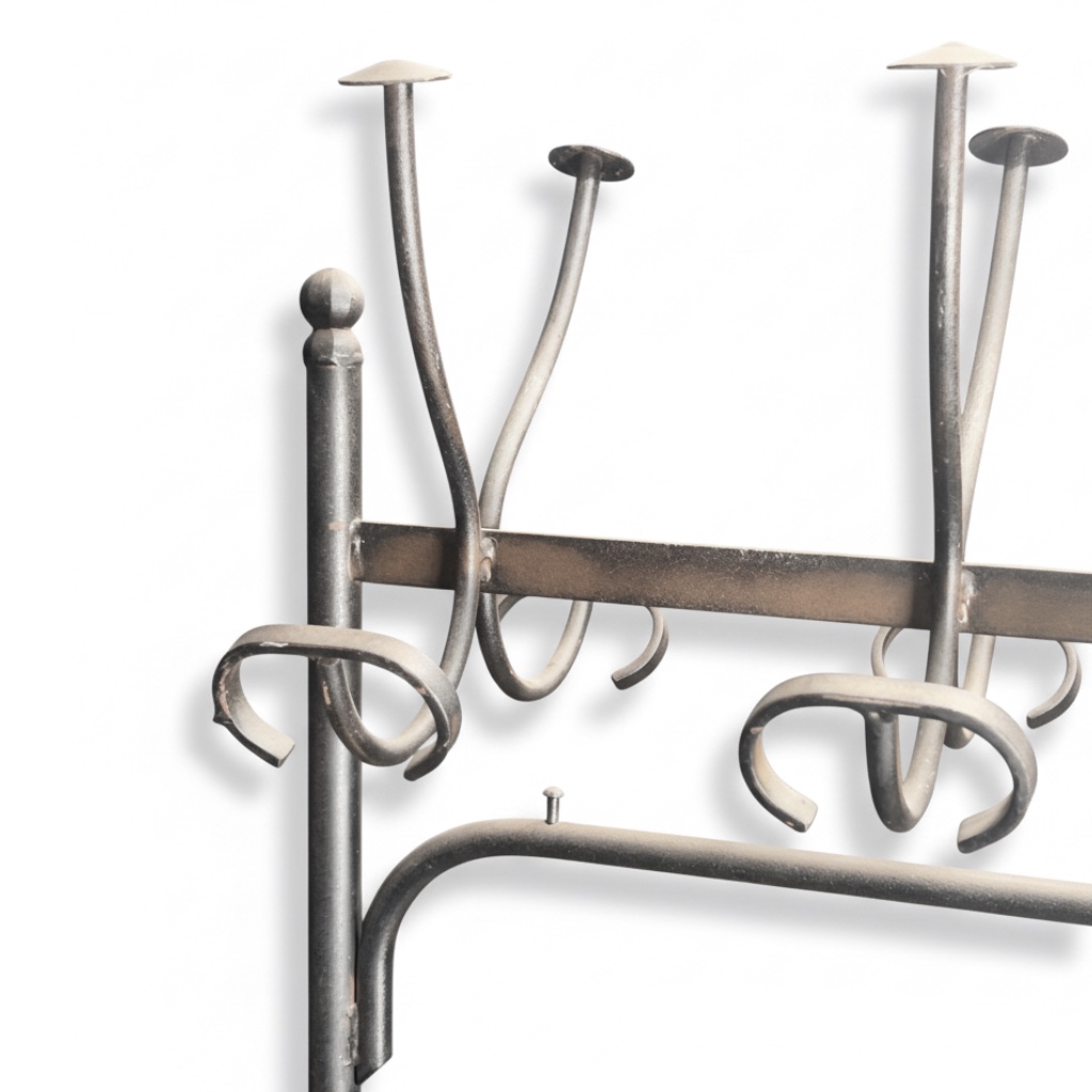 Elegante attaccapanni da ingresso in ferro battuto, realizzato con maestria artigianale nella prima metà del Novecento. La struttura lineare e slanciata è caratterizzata da un’alternanza di elementi verticali e orizzontali, culminanti in una serie di raffinati ganci ricurvi in alto e piedini mossi alla base, espressione di un gusto sobrio e funzionale tipico dell’epoca. La parte inferiore presenta una pratica griglia portaborse o portaombrelli, che ne esalta la versatilità nell'utilizzo quotidiano. La patina originale del ferro valorizza la presenza materica dell’oggetto, regalando fascino autentico e senso della storia a qualsiasi ambiente. Ideale per ingressi, corridoi o studi, questo complemento d’arredo si distingue per l’equilibrio tra robustezza costruttiva e leggerezza visiva.