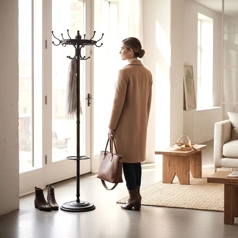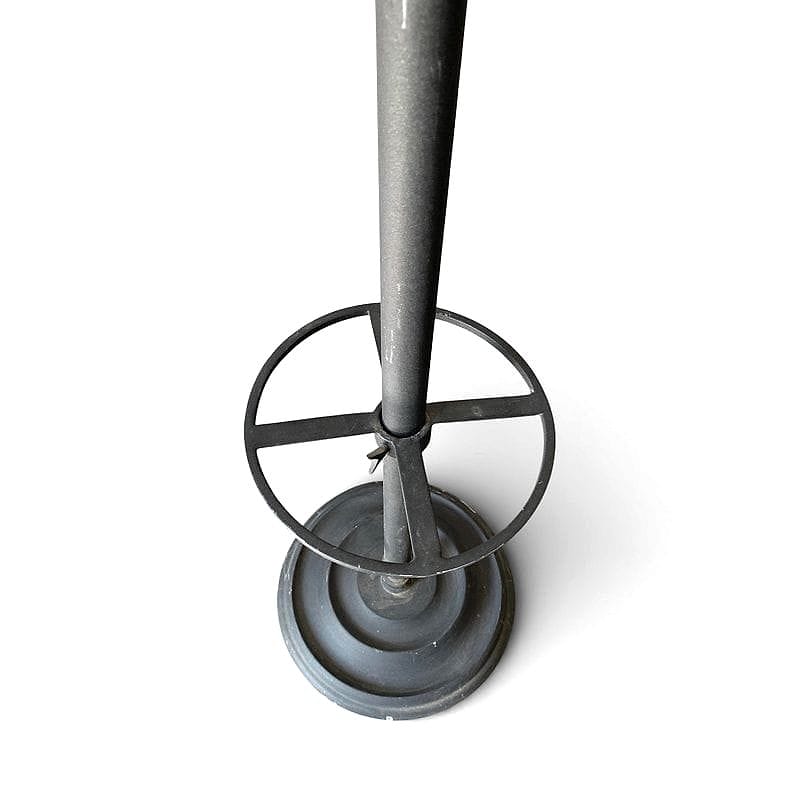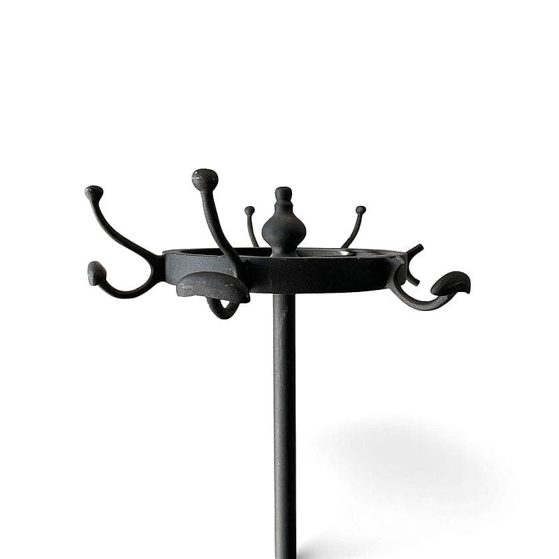 Questo attaccapanni autoportante in ferro battuto replica lo stile tipico dell'inizio del secolo scorso. Il portaombrelli integrato a metà asta, spesso trascurato, è pensato per favorire la raccolta dell’acqua evitando danni al pavimento.