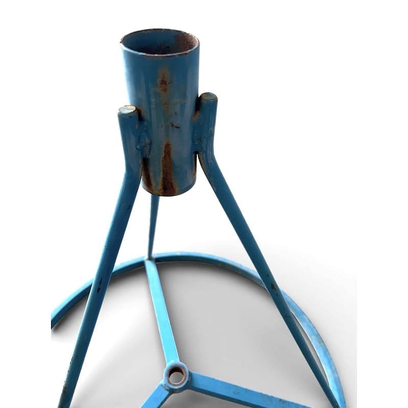 Questa base per ombrellone in tubolare blu nasce probabilmente per uso privato. Tracce di vernice originaria e lievi segni del tempo ne raccontano la lunga vita all'aperto.