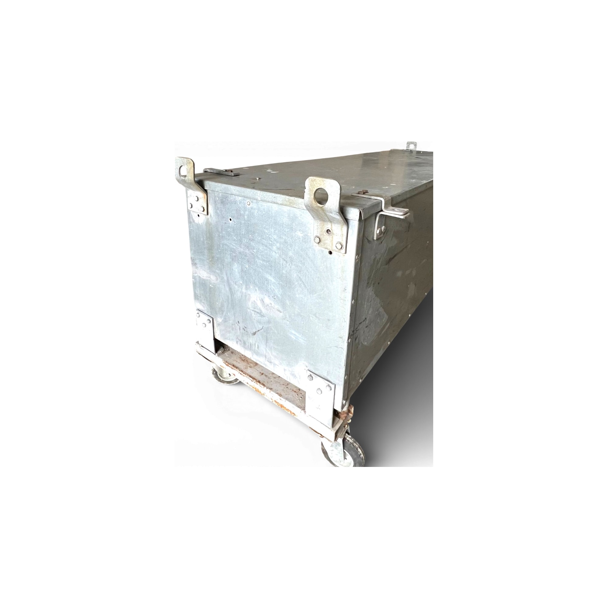 Questo baule industriale fu originariamente impiegato per il trasporto di componenti militari o attrezzature tecniche. Le robuste chiusure a leva e le grandi ruote piroettanti, pensate per logistica pesante, testimoniano la sua destinazione d'uso in ambienti estremi. La lamiera zincata mostra una patina autentica: ogni graffio racconta anni di servizio e spostamenti. Un dettaglio insolito sono i fori d'ispezione sui pannelli laterali, utili per identificarne il contenuto senza aprirlo.