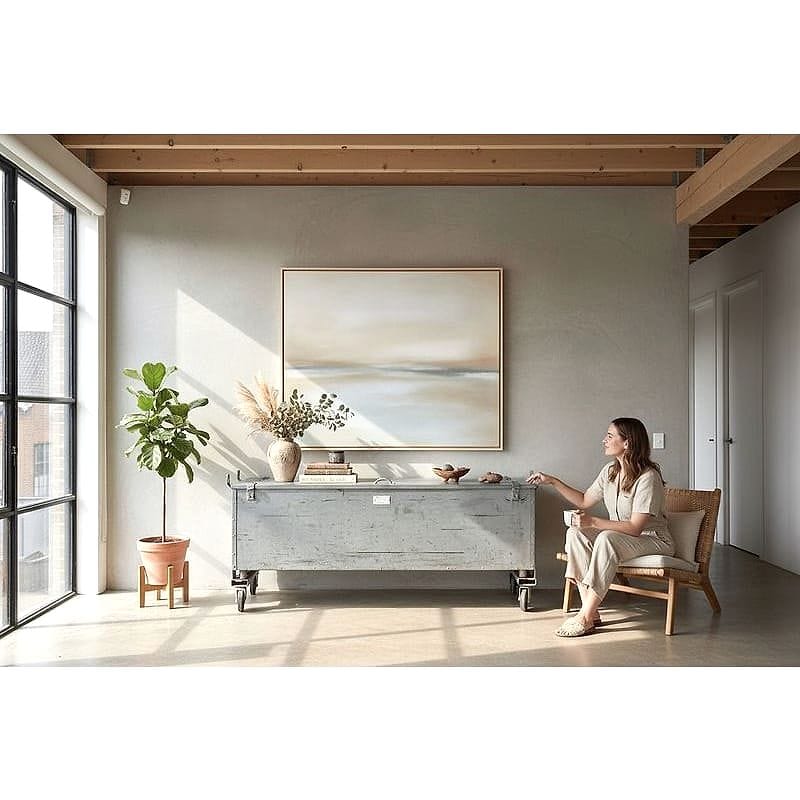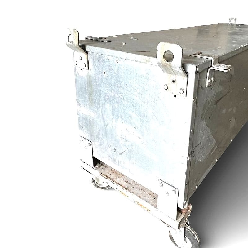 Questo baule industriale fu originariamente impiegato per il trasporto di componenti militari o attrezzature tecniche. Le robuste chiusure a leva e le grandi ruote piroettanti, pensate per logistica pesante, testimoniano la sua destinazione d'uso in ambienti estremi. La lamiera zincata mostra una patina autentica: ogni graffio racconta anni di servizio e spostamenti.