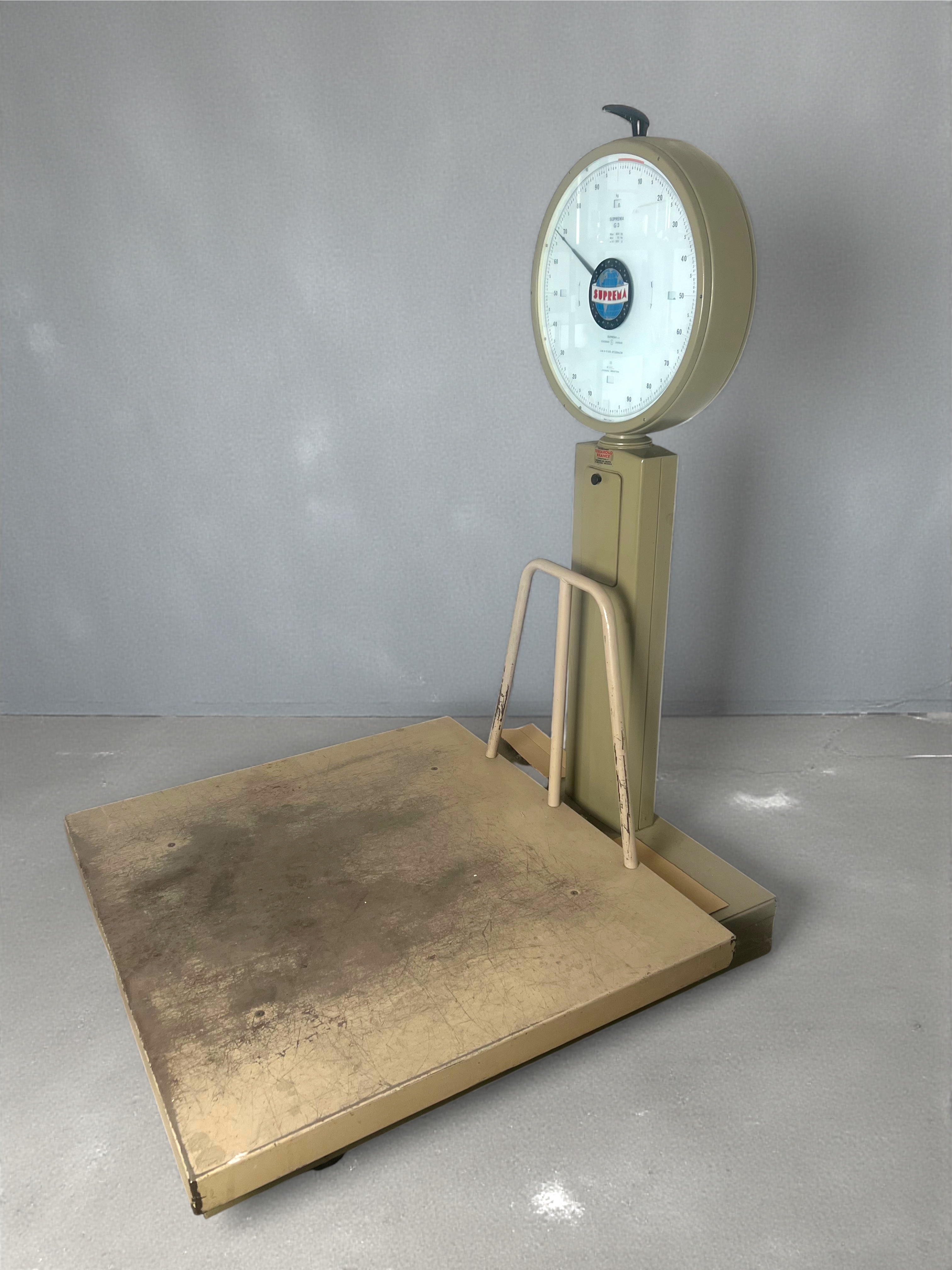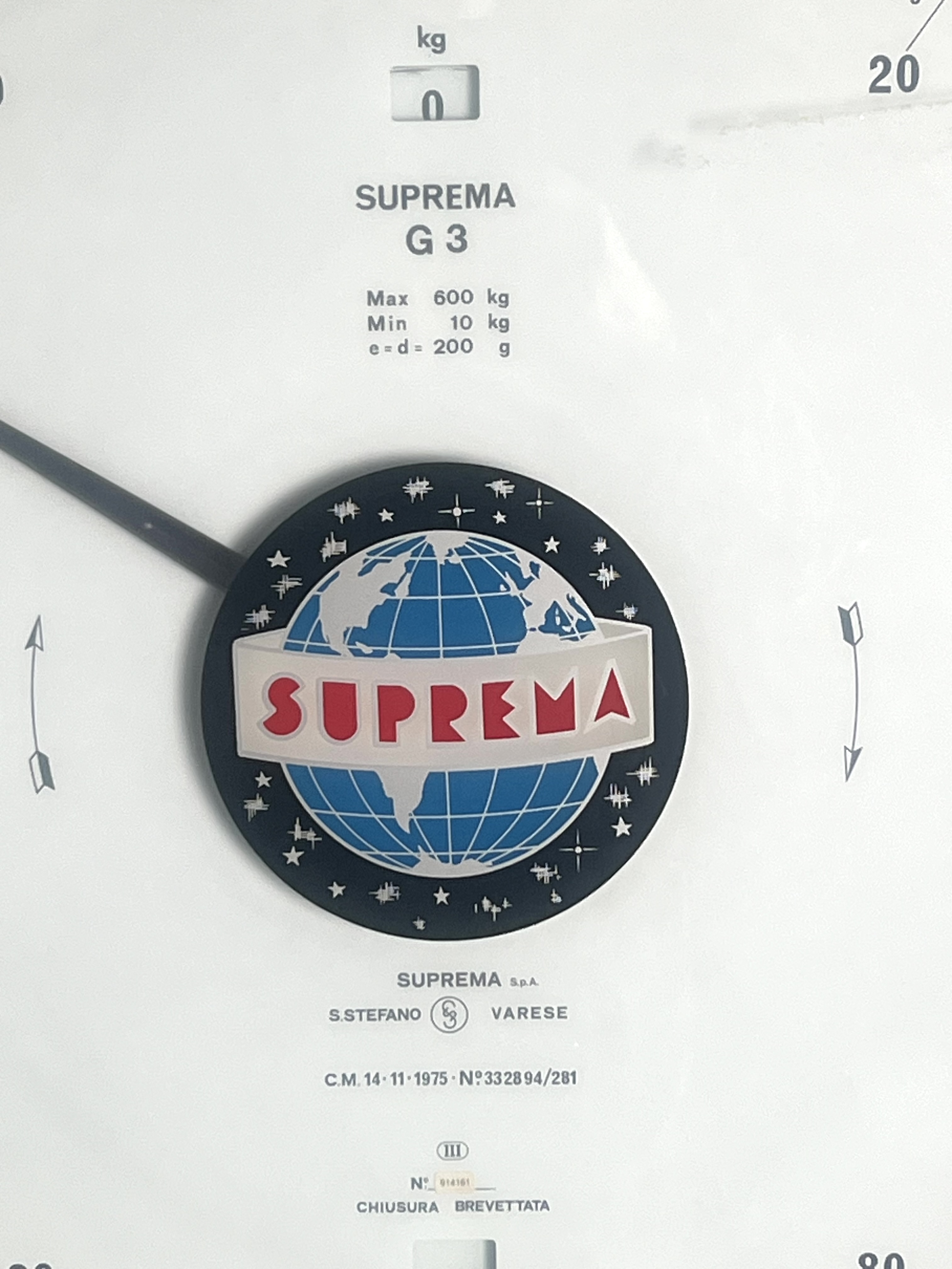 Bilancia industriale modello Suprema G3 prodotta da Suprema S.p.A. a S. Stefano, Varese, datata 1975. Questo strumento di grande formato, robusto ed elegante nella sua linea funzionale, incarna appieno il design tecnico e razionale della seconda metà del Novecento italiano. La struttura in metallo verniciato presenta un quadrante di generose dimensioni con grafica originale, valorizzato dal logo suprema centrale in stile modernista, e un’ampia pedana consente l’utilizzo in ambienti produttivi o logistici. L’oggetto si distingue per l’integrità dei suoi componenti e la presenza della patina autentica dovuta all’uso, particolarmente visibile sulla superficie della pedana. Ideale come pezzo statement per ambienti industriali, loft contemporanei o collezionisti amanti del modernariato tecnico, questa bilancia è una testimonianza tangibile della manifattura italiana anni '70.