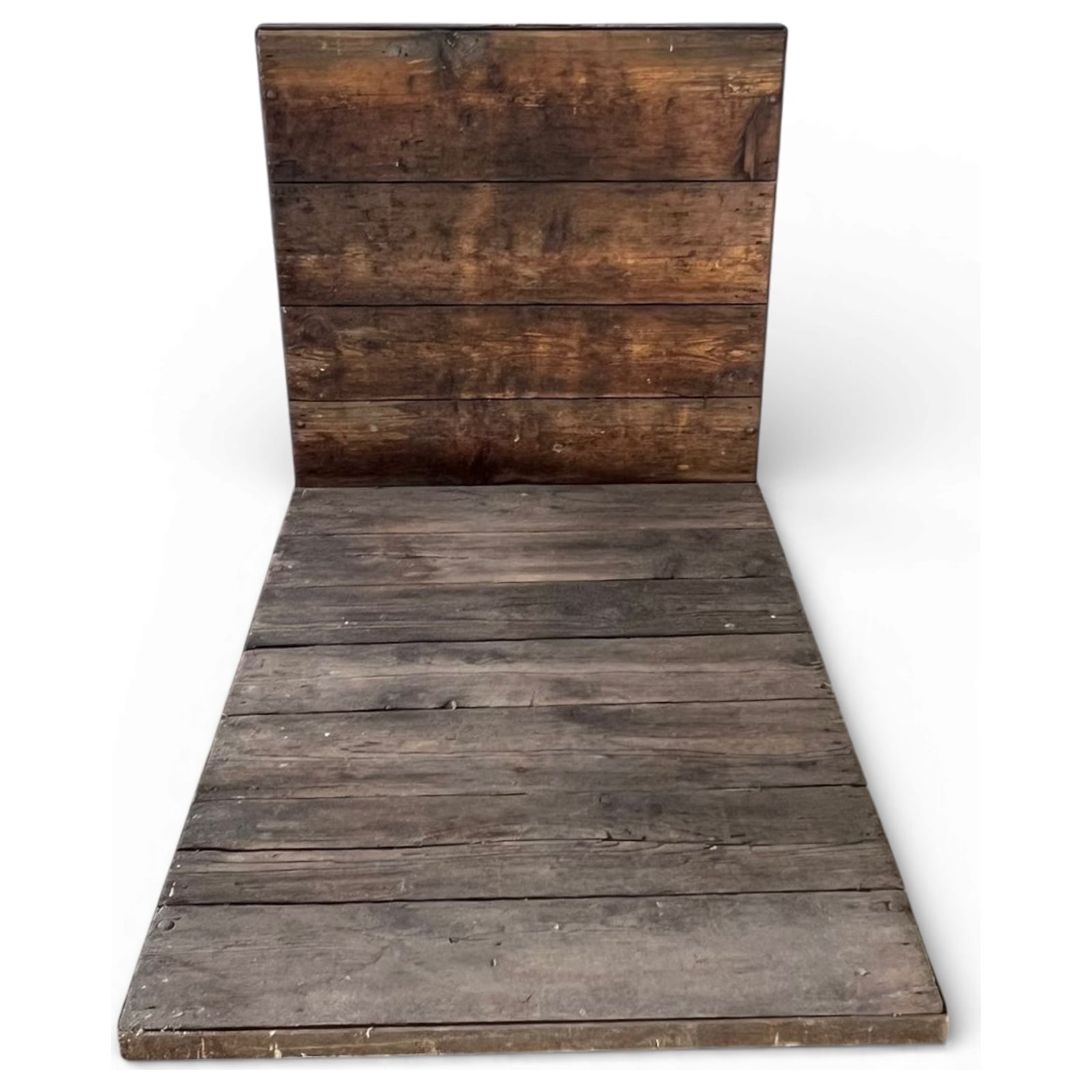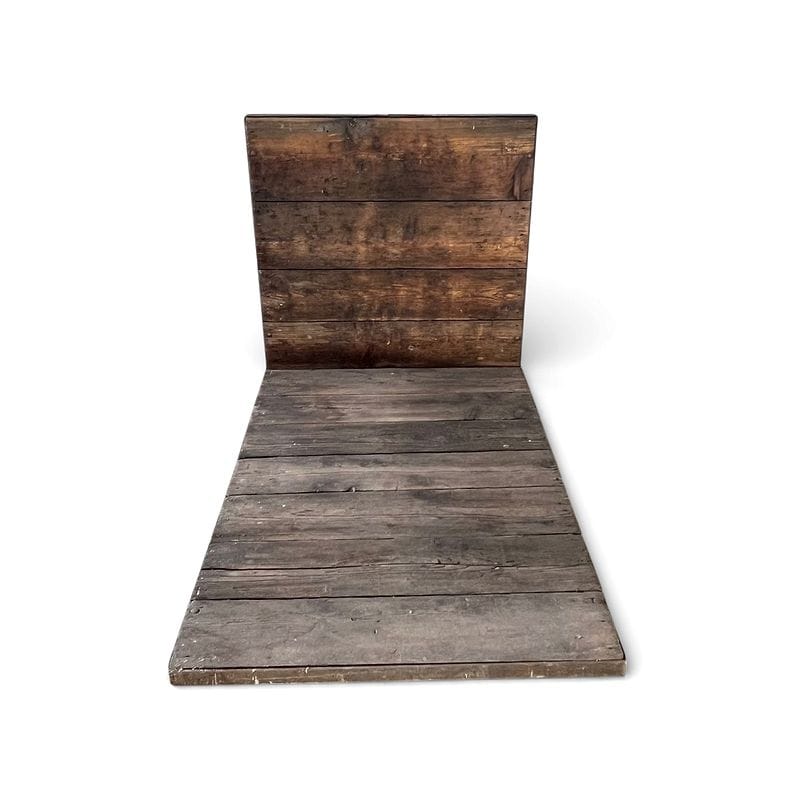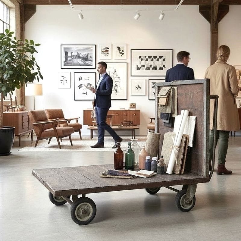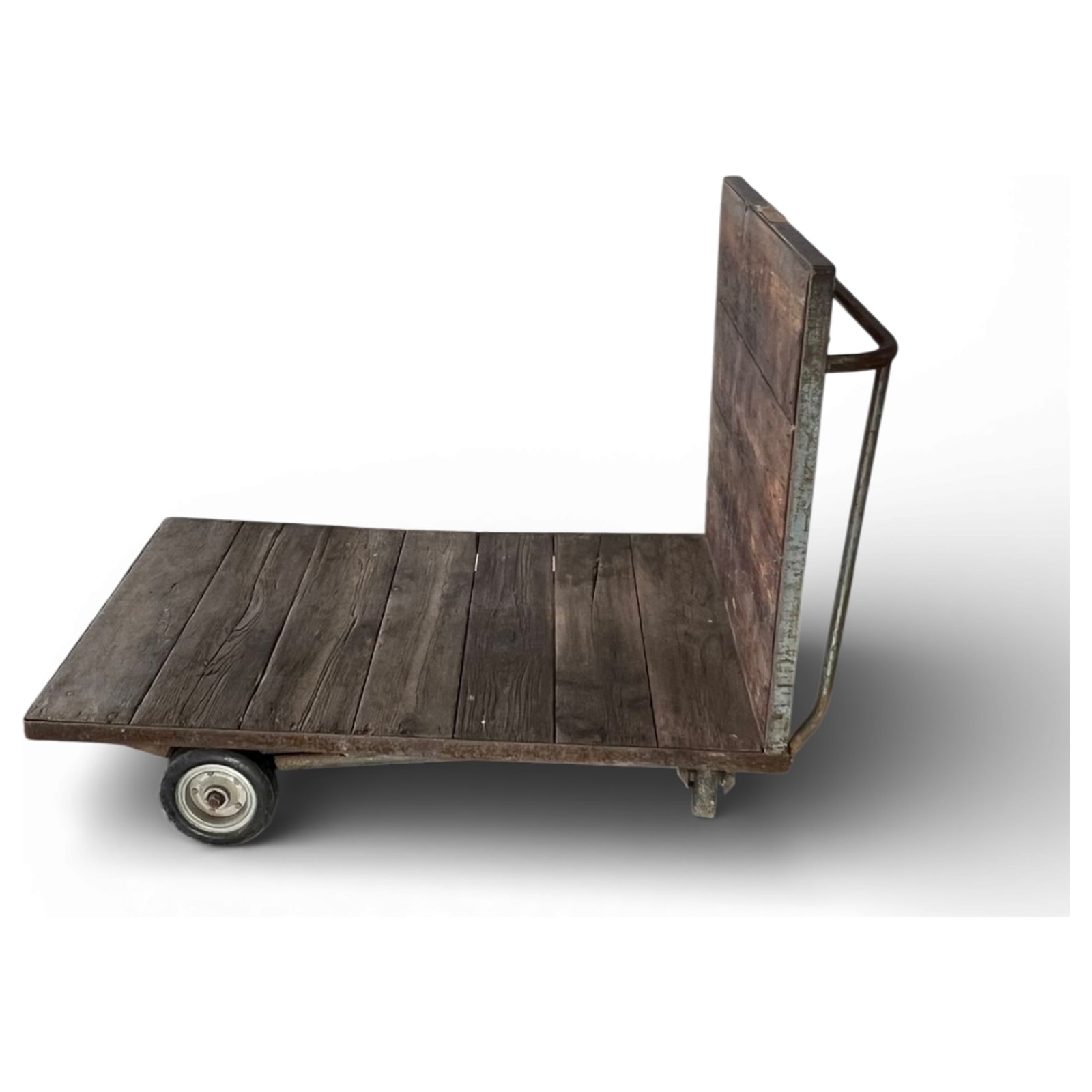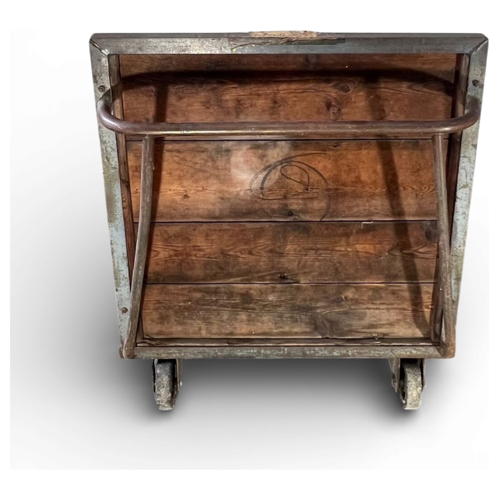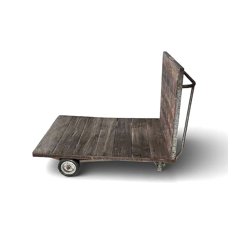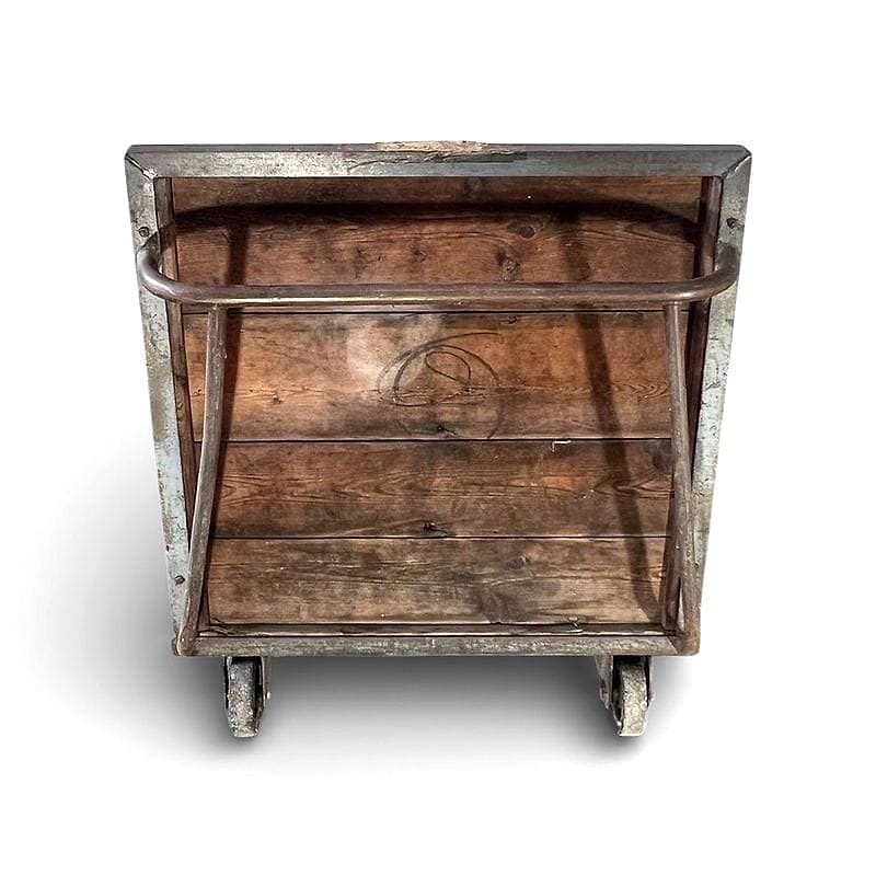 Carrello industriale da magazzino probabilmente utilizzato nel dopoguerra per movimentare merci voluminose negli scali ferroviari. La struttura presenta il raro dettaglio della maniglia curva in ferro pieno, forgiata a mano, scelta per facilitare il traino anche con carichi elevati. Le assi in legno mostrano le tracce di marchi a fuoco, testimonianza della loro originaria funzione logistica.