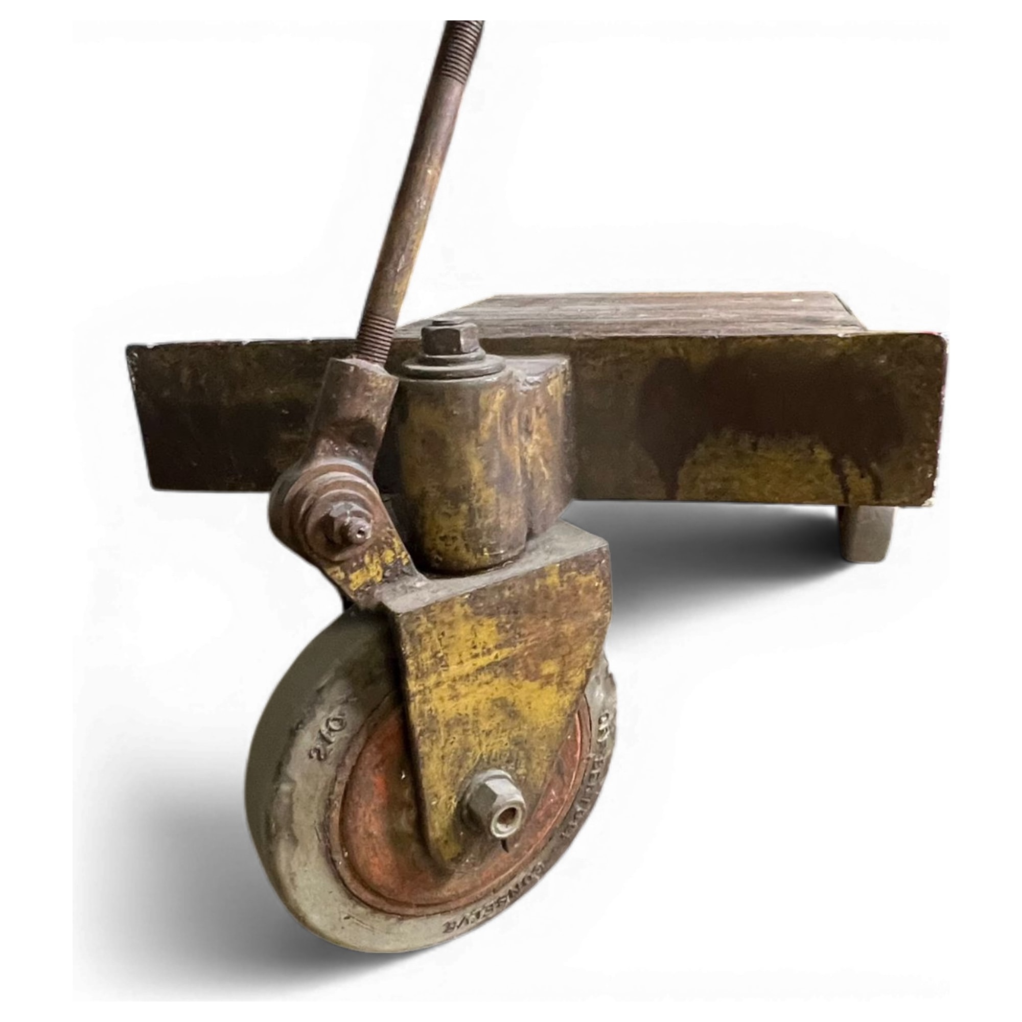 Questo carrello industriale da magazzino, risalente agli anni ’40, conserva ancora tracce gialle della pittura protettiva utilizzata in fabbrica. Le ruote in gomma piena con cerchi in ghisa erano pensate per assorbire le vibrazioni nei pavimenti in cemento delle officine. Una curiosità: il braccio di sterzata è fissato da una vite imperdibile forgiata a mano, dettaglio raro ormai scomparso nei modelli posteriori.