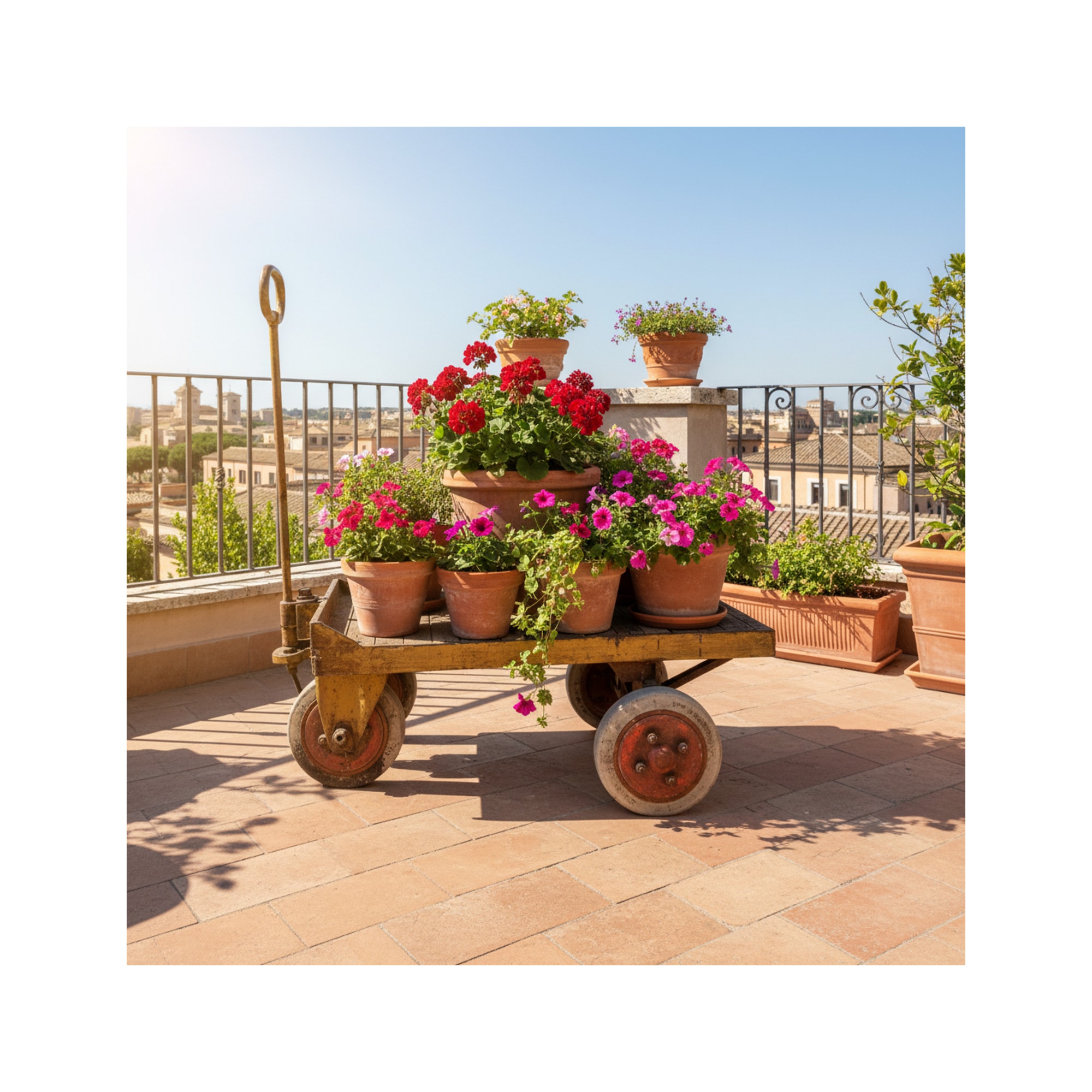 - Struttura in legno massello (faggio o frassino industriale), ruote in gomma piena con cerchio in ghisa, ferrature in acciaio verniciato o ossidato, tracce di pittura gialla protettiva a base piombo