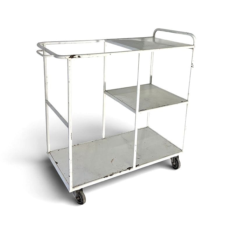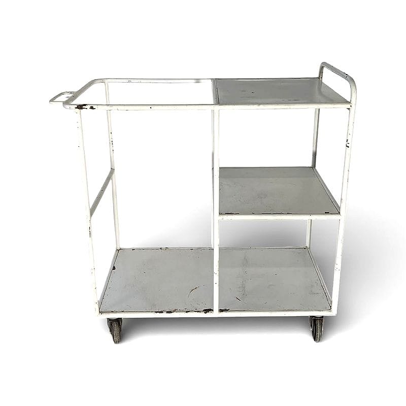 Vecchio carrello industriale su ruote, proveniente probabilmente da un laboratorio o magazzino degli anni '50. L'uso intensivo è narrato dalle sbeccature e dalle ossidazioni a vista, testimoni silenziosi di decenni di lavoro.