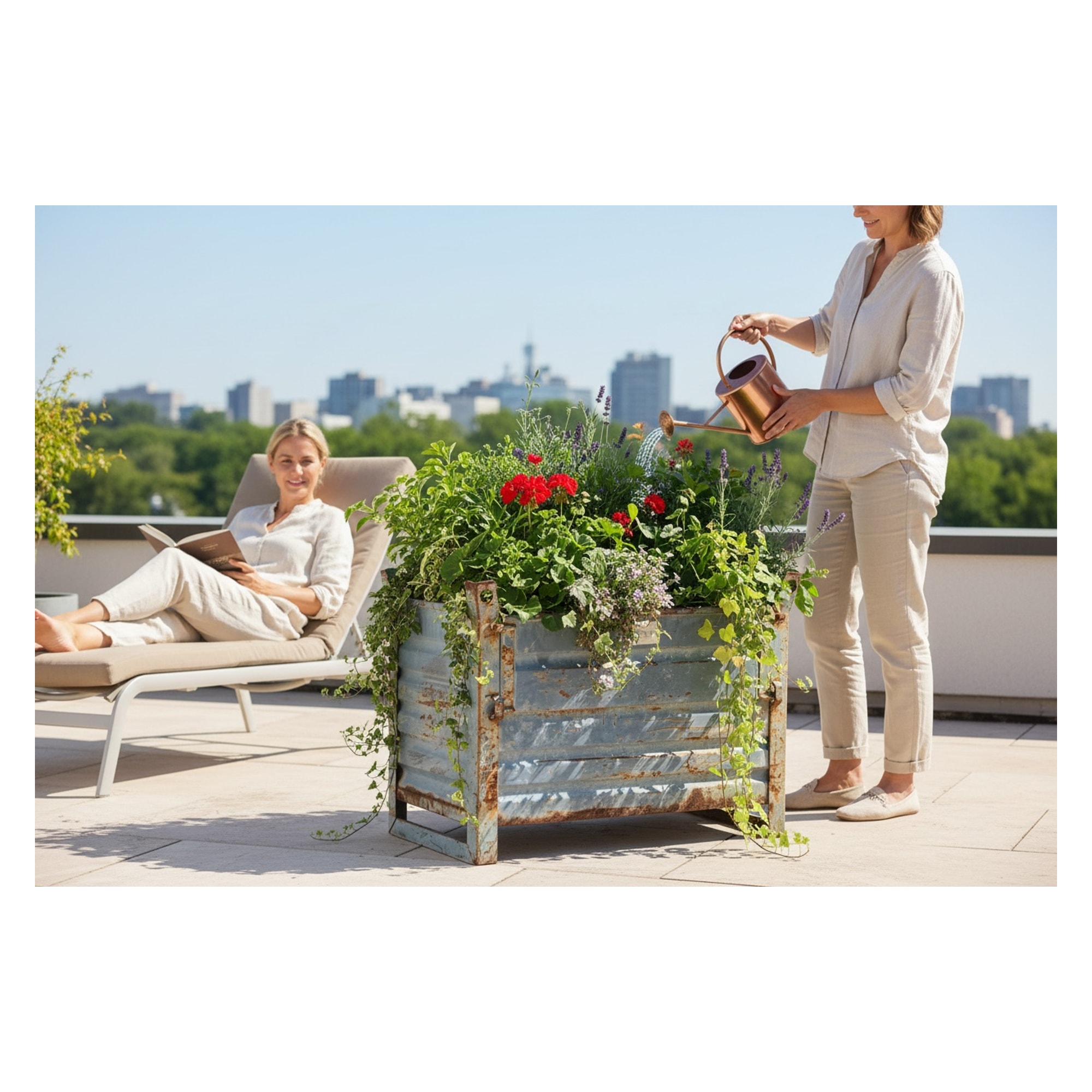 Cassone industriale originariamente usato per lo stoccaggio in fabbriche dell'Europa centro-settentrionale, ora rivalutato come elemento scenografico e fioriera urbana. Il dettaglio curioso: la zincatura originaria serviva a resistere agli agenti chimici nelle linee produttive pesanti. Perfetto per chi apprezza il fascino autentico del recupero industriale.