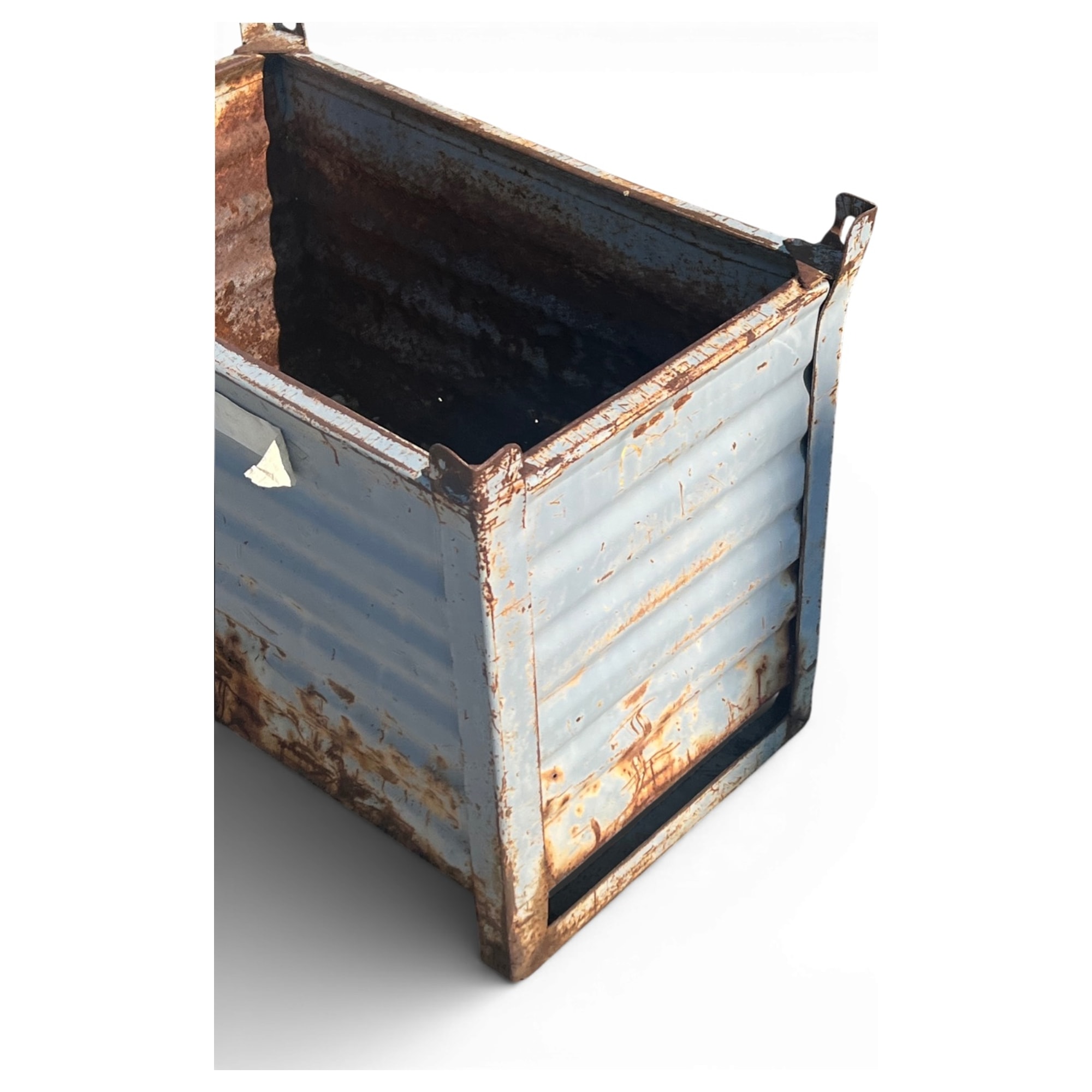 Questo cassone industriale, nato per la logistica negli stabilimenti europei degli anni '60, è caratterizzato da una robusta lamiera ondulata con angoli dotati di fori progettati per l’impilamento mediante gru. La particolare colorazione blu, ossidata dal tempo, racconta il dialogo tra funzione e memoria industriale. Dettaglio singolare: i fianchi presentano grandi maniglie per il trasporto, pensate per l’efficienza di magazzino ma oggi reinterpretate come elemento estetico urbano.