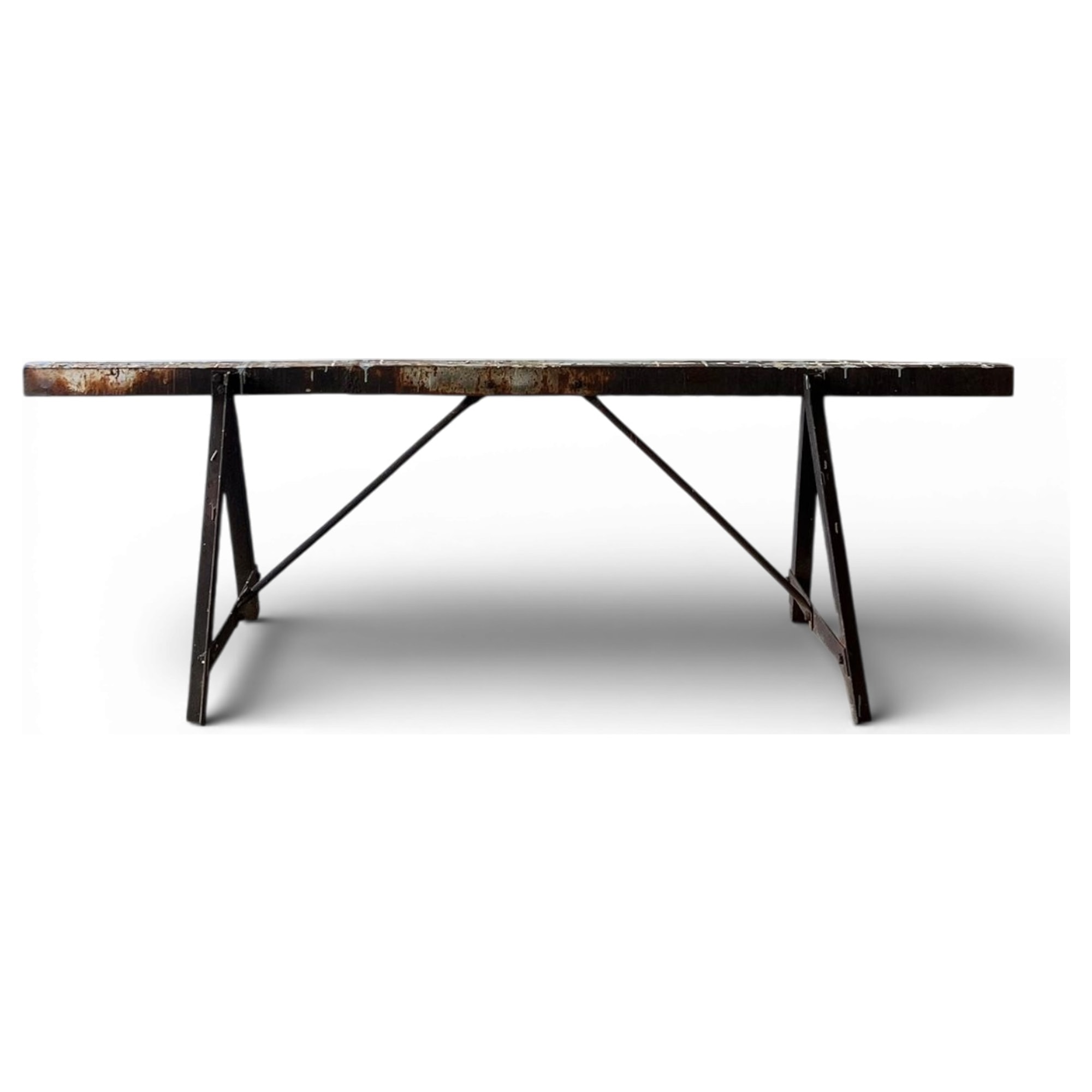 Cavalletto industriale in ferro, proveniente da una falegnameria anni '40, conservato con la ricca patina originale e tracce di antiche lavorazioni. Il dettaglio più affascinante è la struttura a doppio rinforzo diagonale, progettata per sopportare carichi eccezionali senza deformarsi. Alcune officine del nord Italia li adattavano come basi per tavoli utilizzando vecchie porte industriali.