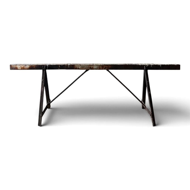 Cavalletto industriale in ferro, proveniente da un'officina degli anni '40, conservato con la ricca patina originale e tracce di antiche lavorazioni.