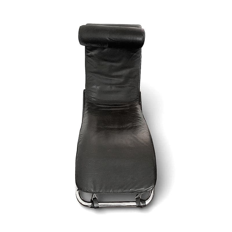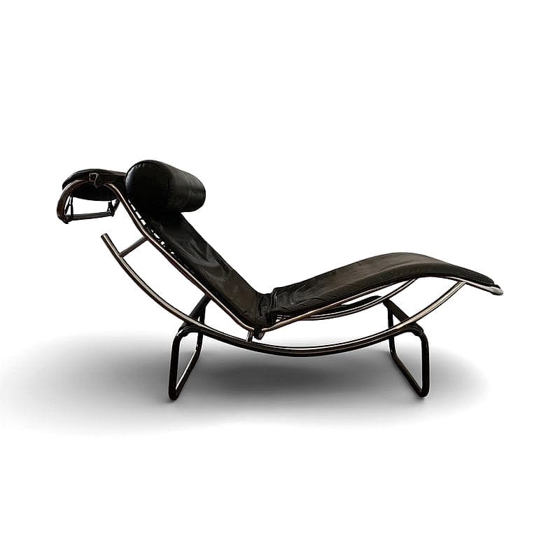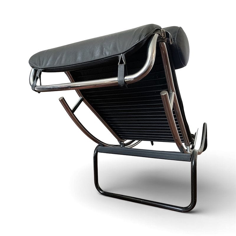 La struttura a doppia curvatura di questo chaise longue richiama l’ossessione anni ‘70 per l’equilibrio visivo e la sospensione del corpo. Degno di nota il sistema elastico a cinghie che sostiene la seduta, pensato per adattarsi perfettamente alle forme del corpo. Il profilo tubolare integra elegantemente la poggiatesta cilindrica, suggerendo una continuità stilistica tipica della produzione europea del periodo.