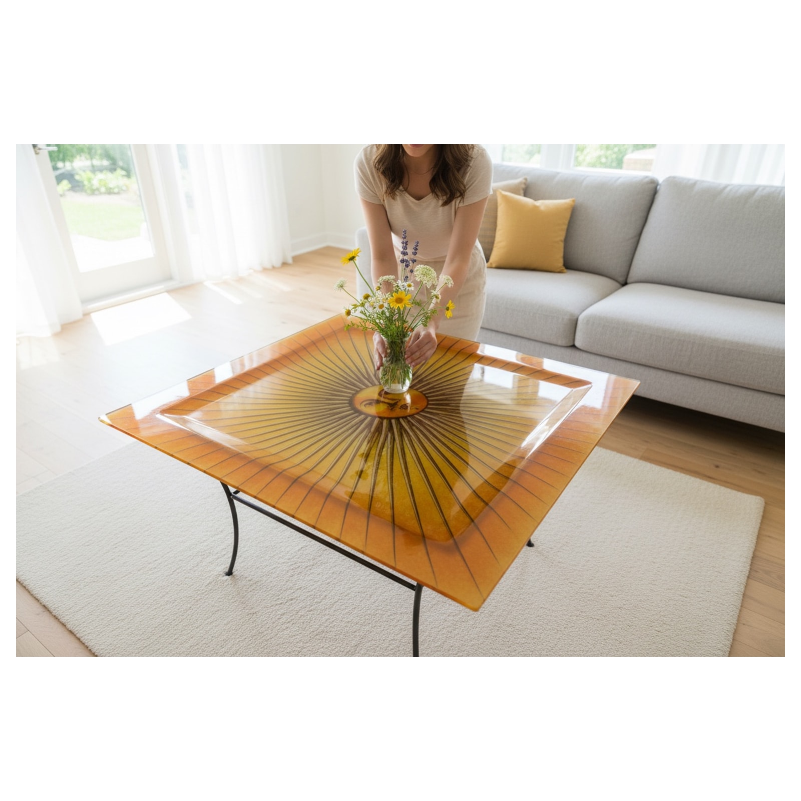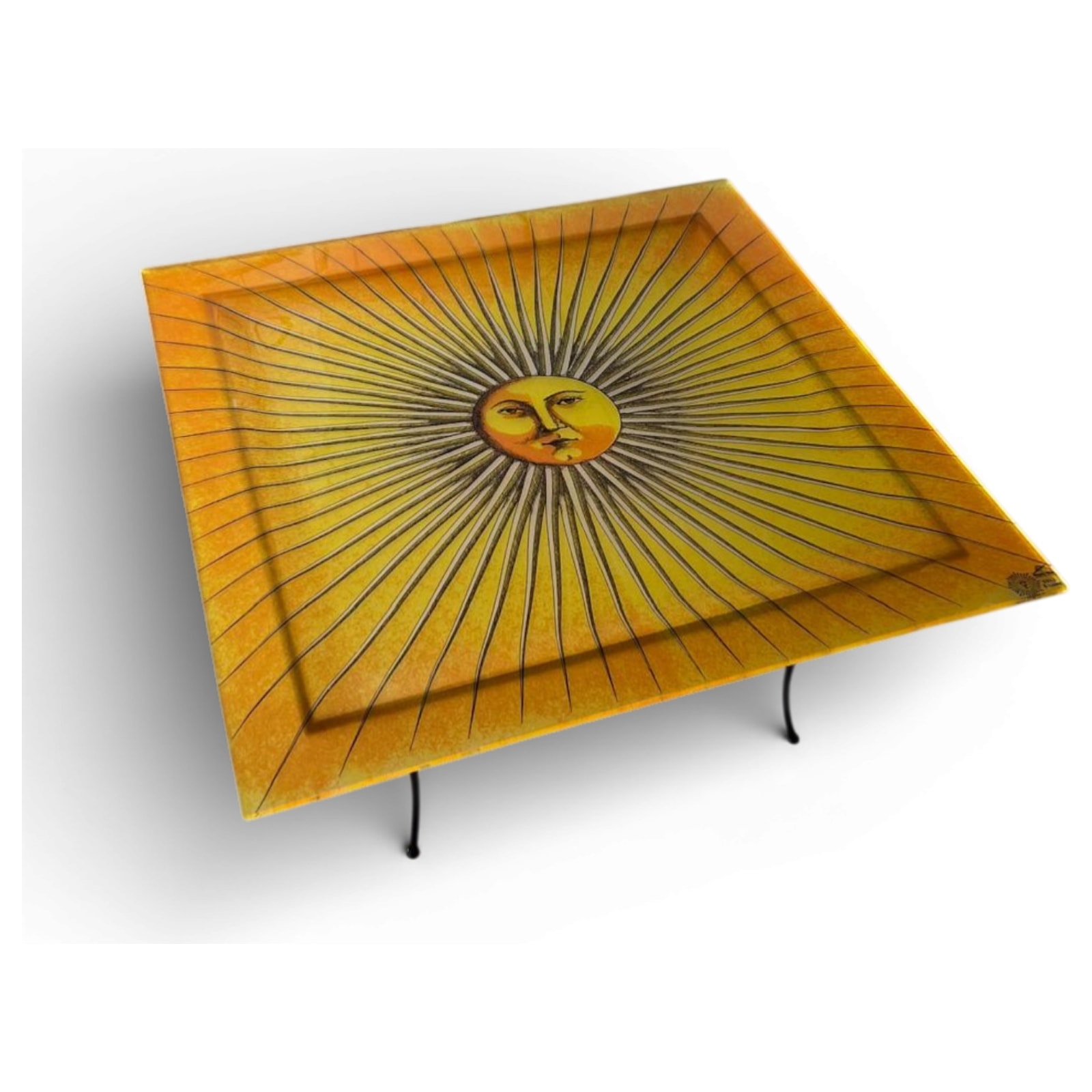 Il piano in vetro raffigura un Sole dal volto enigmatico, dettaglio tipico della grafica decorativa italiana degli anni '60. La resa cromatica giallo-aranciata viene ottenuta con pigmenti inglobati a caldo, tecnica all’epoca apprezzata per la sua durata e brillantezza. Il bordo inclinato e la struttura in ferro sottile donano un’inedita leggerezza al pezzo. Un dettaglio insolito: il disegno centrale pare ispirarsi a tarocchi e simbolismo rinascimentale.
