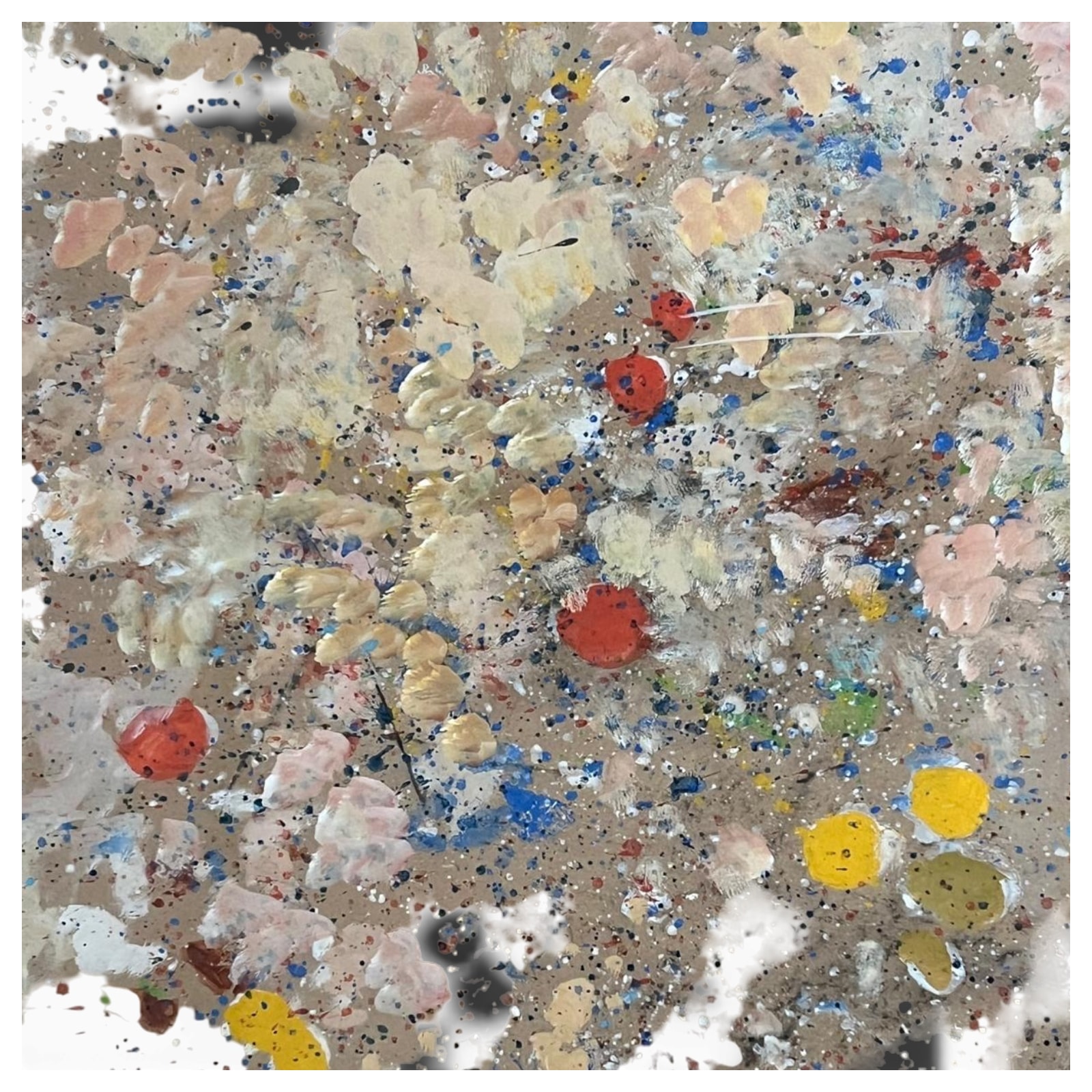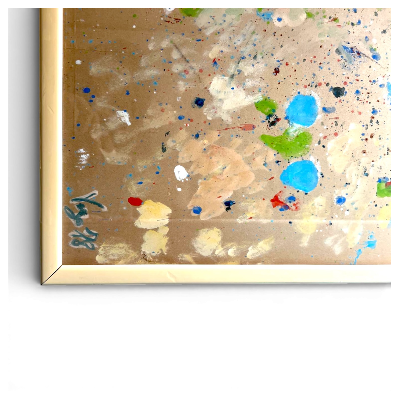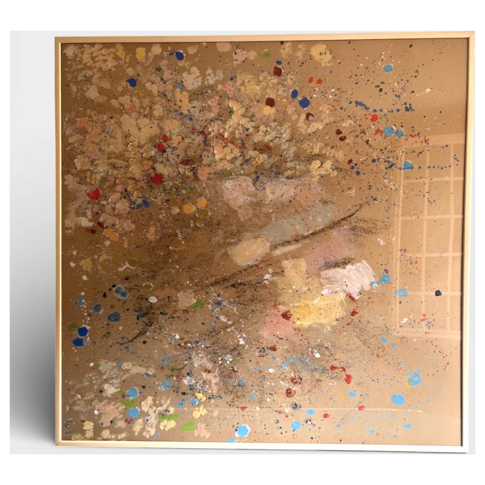 Opera informale che sfrutta la texture del cartone dorato come base luminosa, rendendo ogni stesura di colore sorprendentemente vibrante. La tecnica 'drip' evidenzia una gestualità rapida, mentre l’uso di blu e rossi puri contrasta con la raffinatezza delle velature beige e oro. Il cartone dorato, elemento atipico negli anni '80, conferisce un riflesso unico a seconda della luce ambiente.