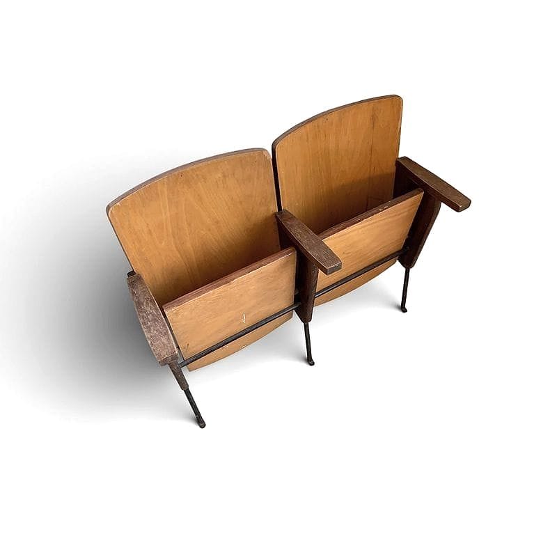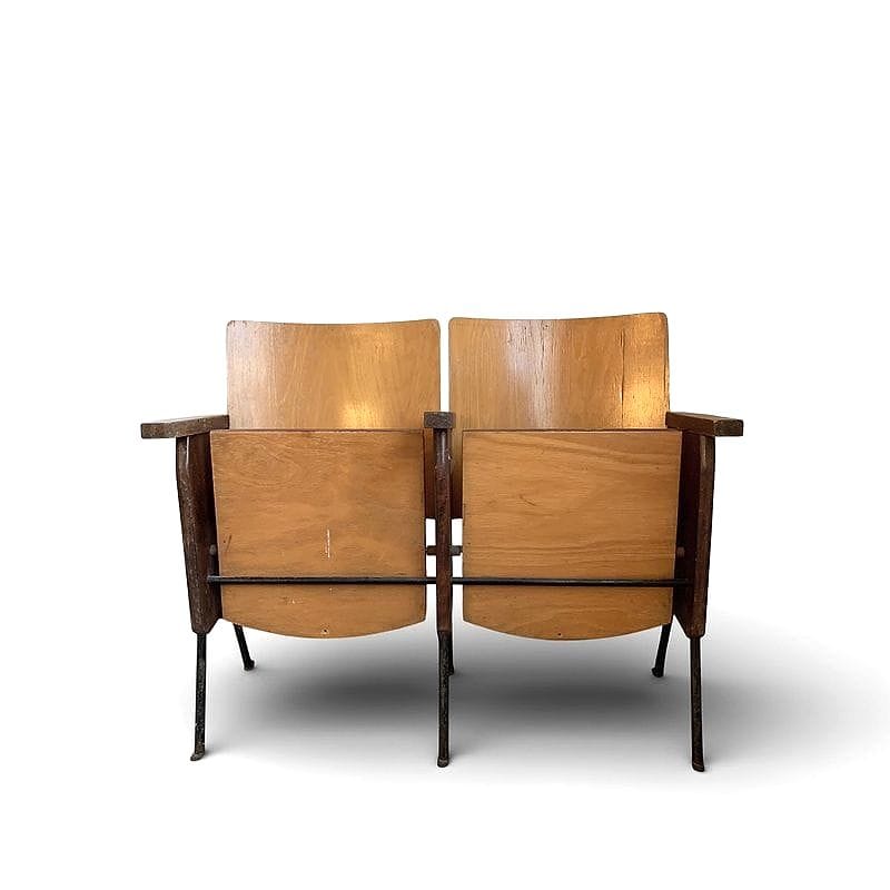 Questa seduta doppia proveniva da una platea di teatro della metà del secolo scorso, dove ogni movimento era dettato da un ingegnoso sistema a molla nascosto sotto la seduta. Il legno curvato, ottenuto tramite vapore, era la risposta industriale dell’epoca alla necessità di grande resistenza in spazi pubblici.