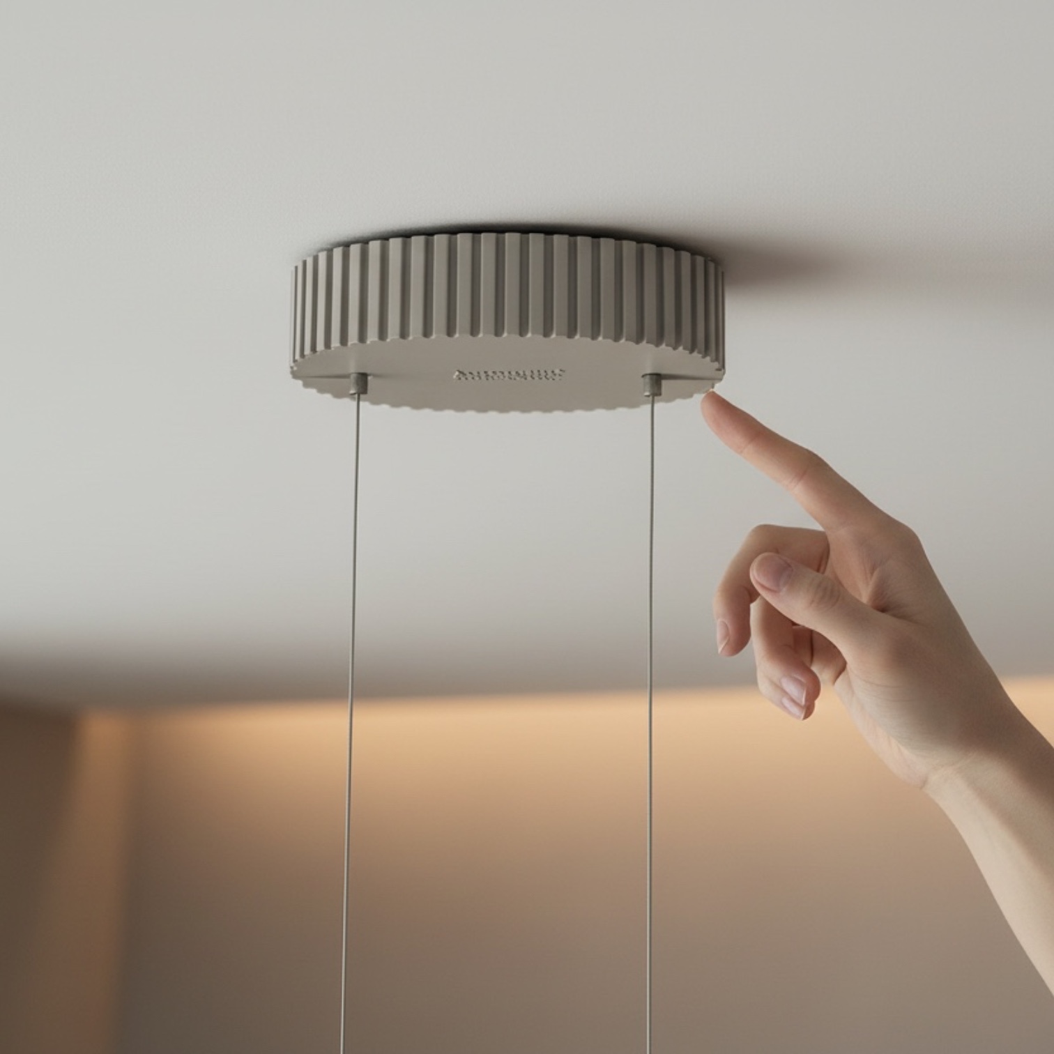 - Alluminio verniciato a polvere grigio, dettagli in policarbonato e acciaio, cavetto acciaio, rosone plastica tecnica