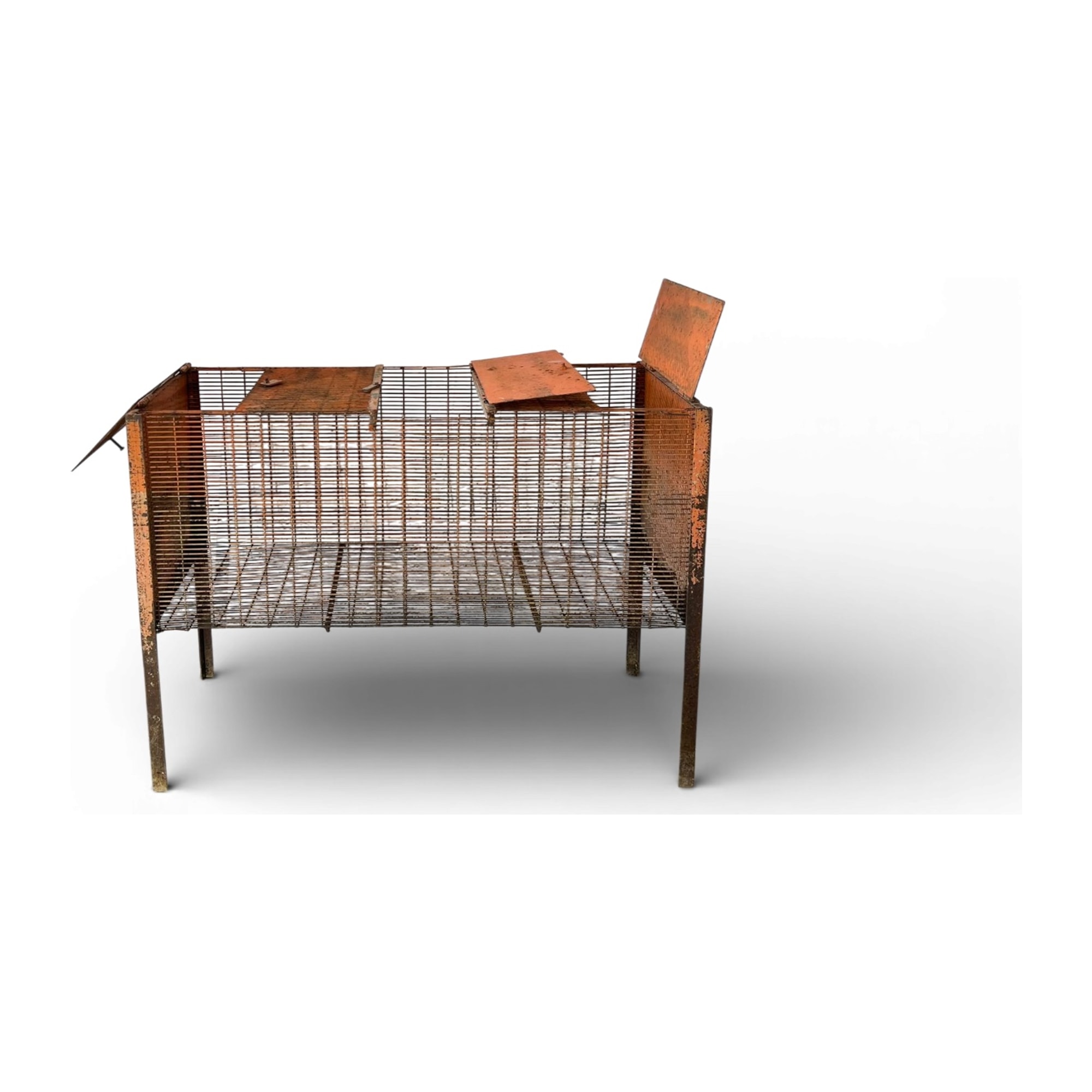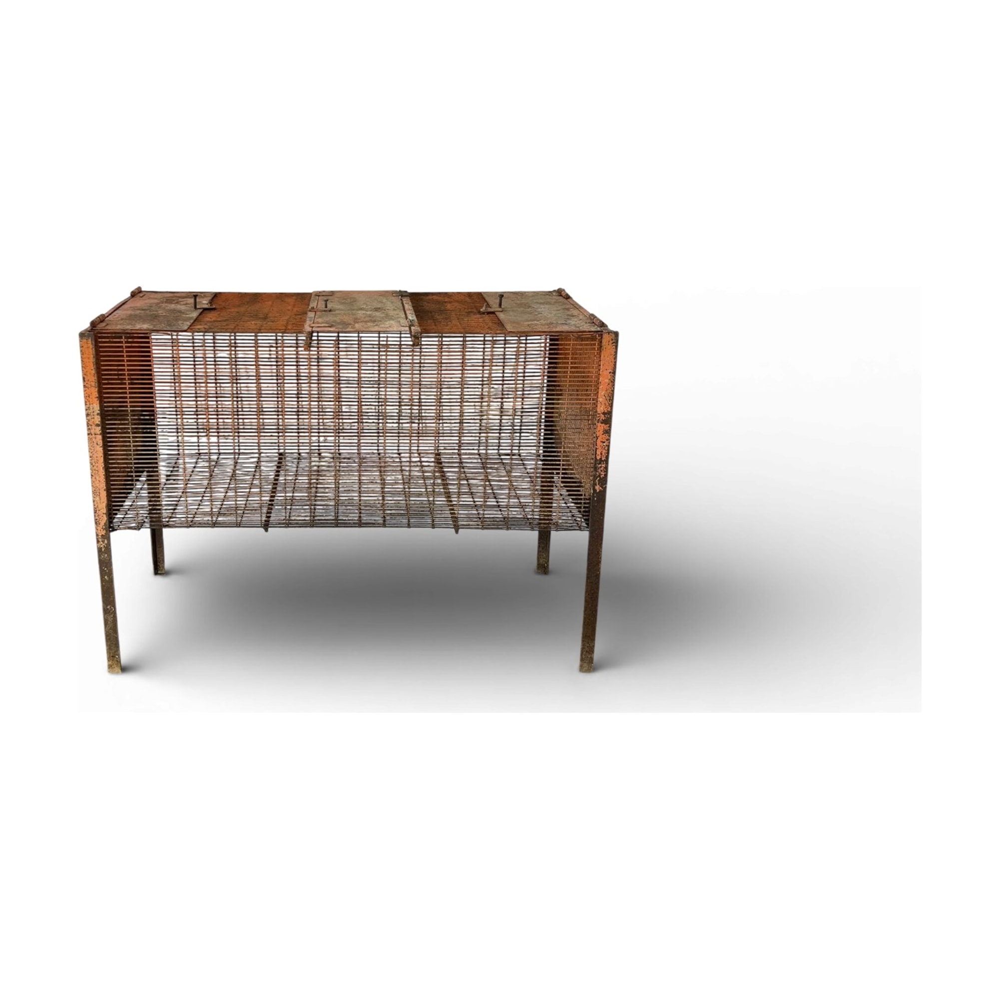 Vecchia gabbia industriale da allevamento, con struttura interamente saldata a mano e originali sportelli scorrevoli superiori. L'usura della vernice arancio rivela stratificazioni di storia rurale. Dettaglio curioso: molti collezionisti upcycleri la utilizzano oggi come contenitore per legna o libreria industriale.