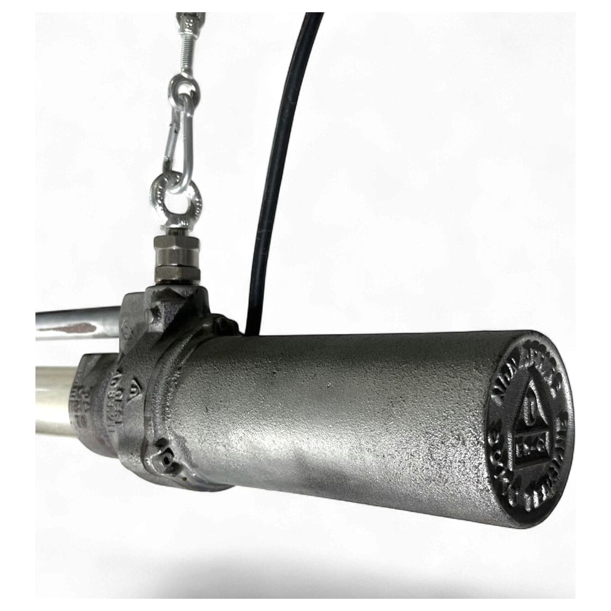Questa lampada nasce per ambienti industriali dove l'ermeticità era questione di sicurezza: il coperchio a vite e la guarnizione originale assicuravano protezione da polveri e vapori. Un dettaglio raro è il sigillo fuso sul terminale che identifica la colata d'origine, segno dell'attenzione alle certificazioni degli anni '60. L'eleganza brutalista si sposa qui con una funzionalità che ha il sapore di autentico industrial heritage.