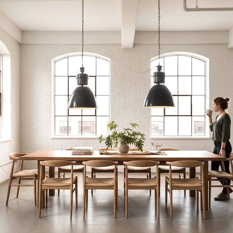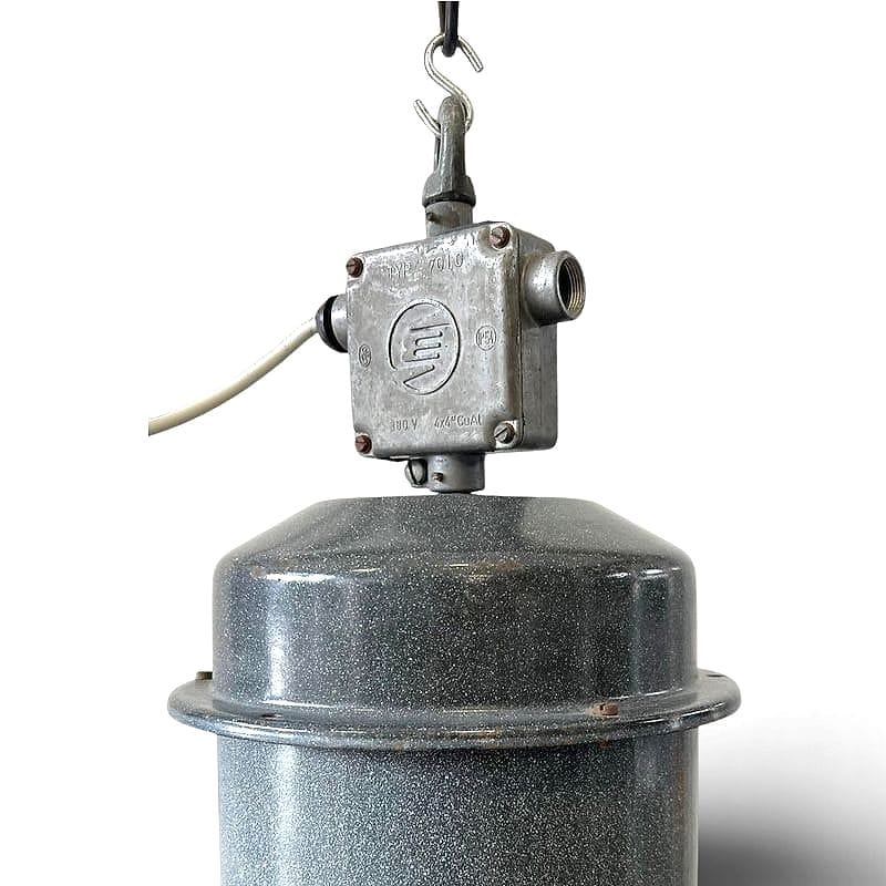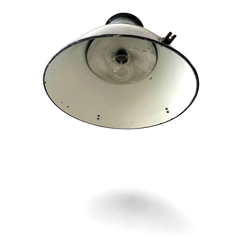 Autentica lampada industriale smaltata, recuperata da vecchie fabbriche europee. Il piccolo dettaglio sorprendente è l'isolatore elettrico in ceramica all'interno del portalampada, pensato per resistere a lunghi anni di utilizzo continuo. Questo modello veniva spesso scelto per la sua resistenza alle alte temperature e ai solventi, un tratto raro nei pezzi prodotti dopo il boom economico. L'interno bianco riflettente massimizza la diffusione luminosa, segno di un'attenta progettazione tecnica.