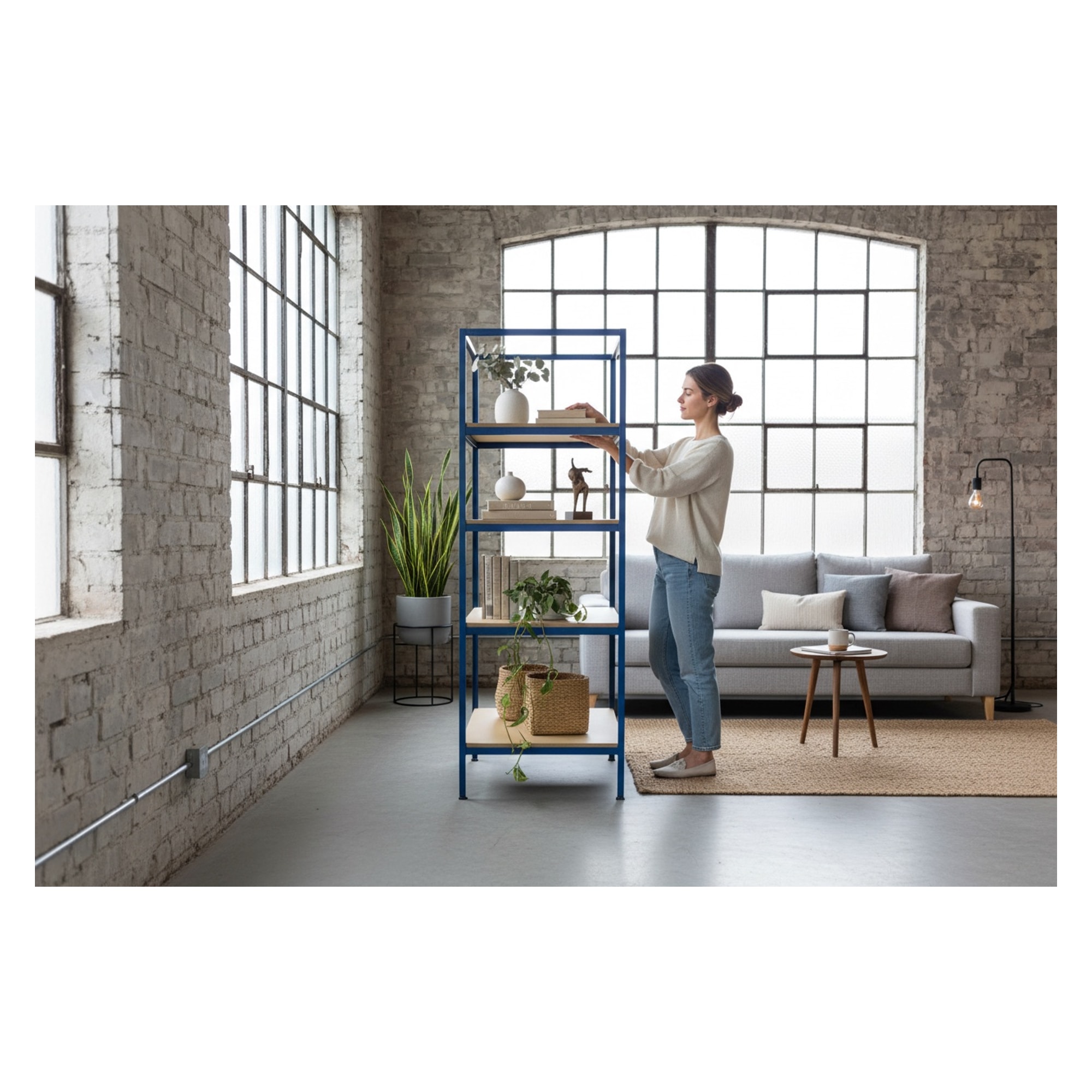 libreria industriale blu con ripiani in compensato