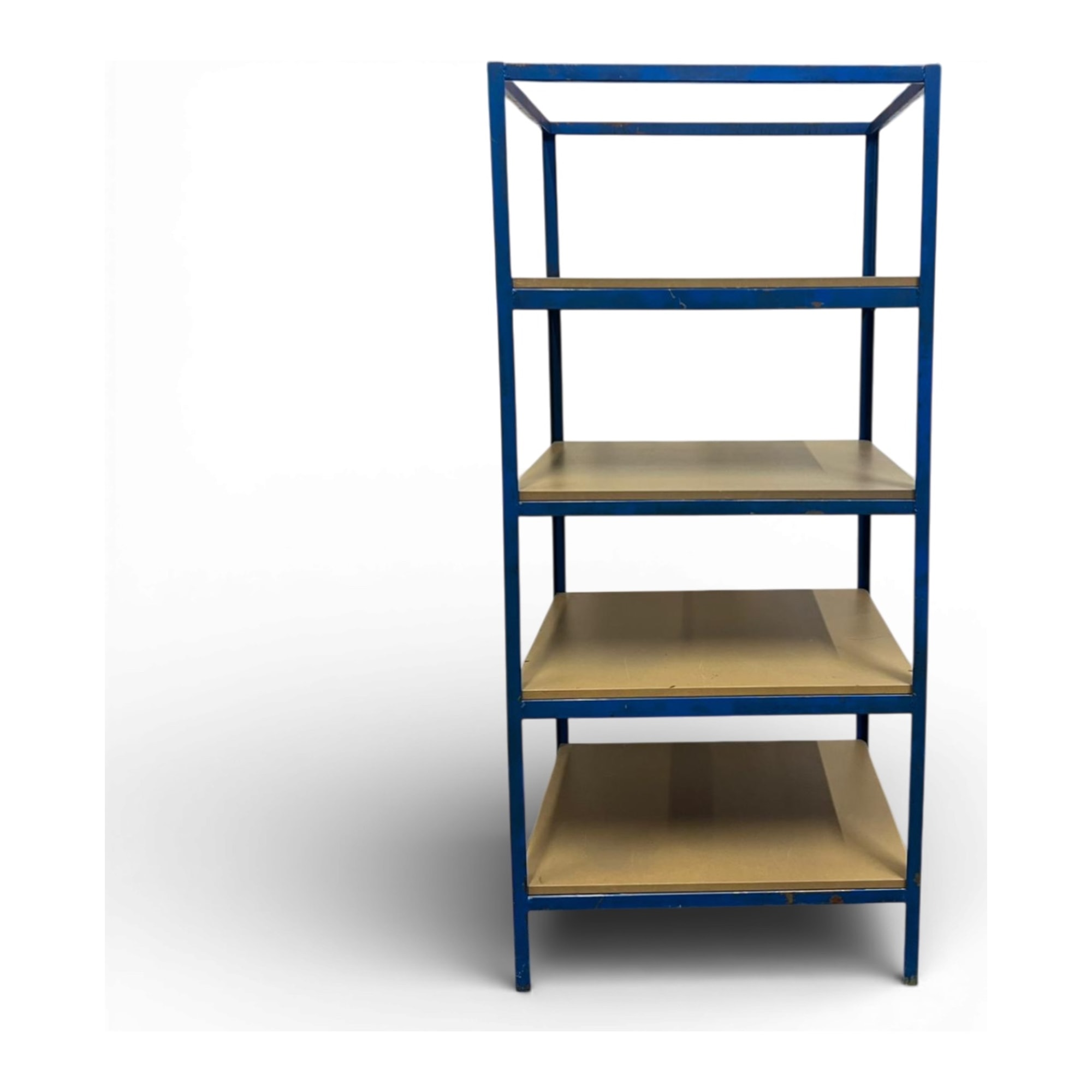 - Struttura in metallo tubolare verniciato blu, ripiani in compensato industriale a vista