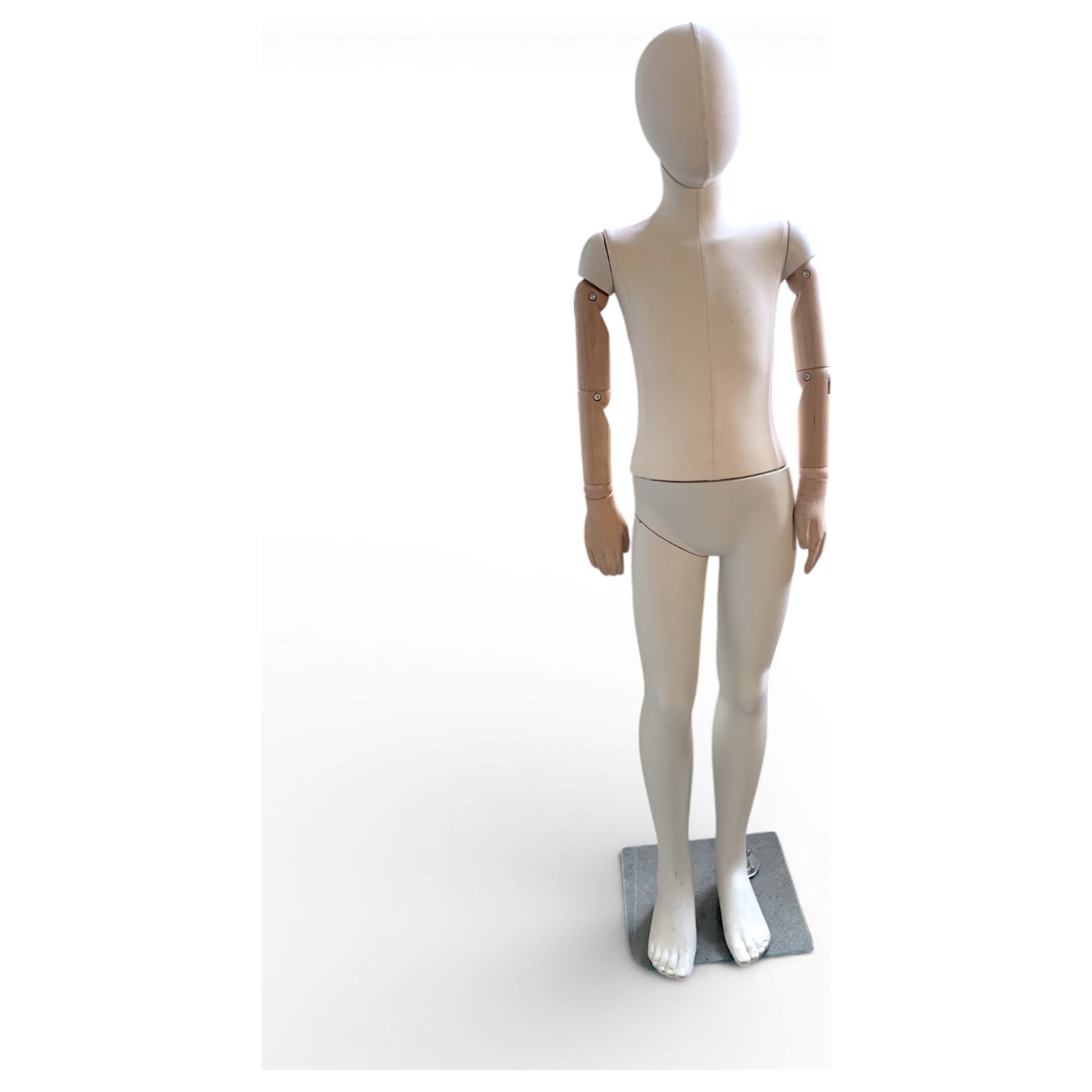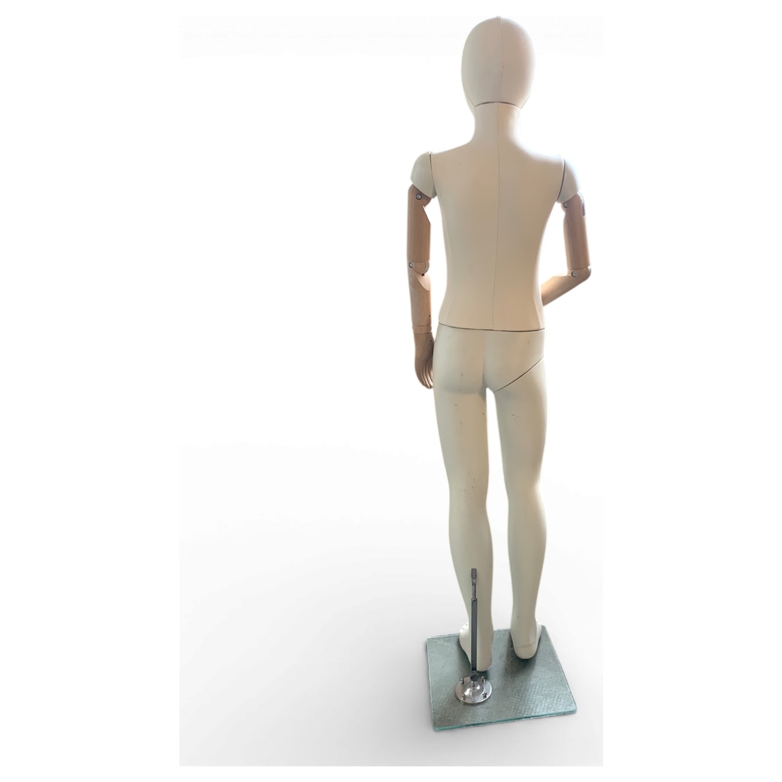 Questo raro manichino sartoriale da bambino spicca per le braccia in legno snodate, dettaglio tecnico che lo rende particolarmente ricercato tra gli allestitori vintage. La base in vetro con attacco regolabile testimonia una produzione attenta alla stabilità e alla versatilità espositiva.