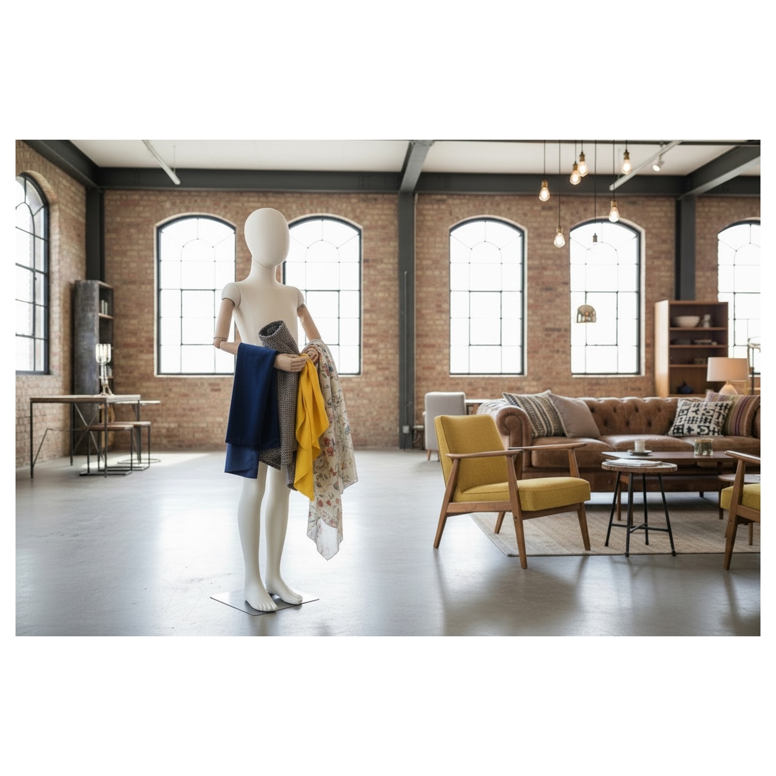 - Manichino tipico del design sartoriale con particolare attenzione alla snodabilità e versatilità espositiva. Rappresenta l'uso innovativo della combinazione di materiali diversi per allestimenti moda e vetrinistica, riflettendo la moda internazionale senza eccessi decorativi facciali.