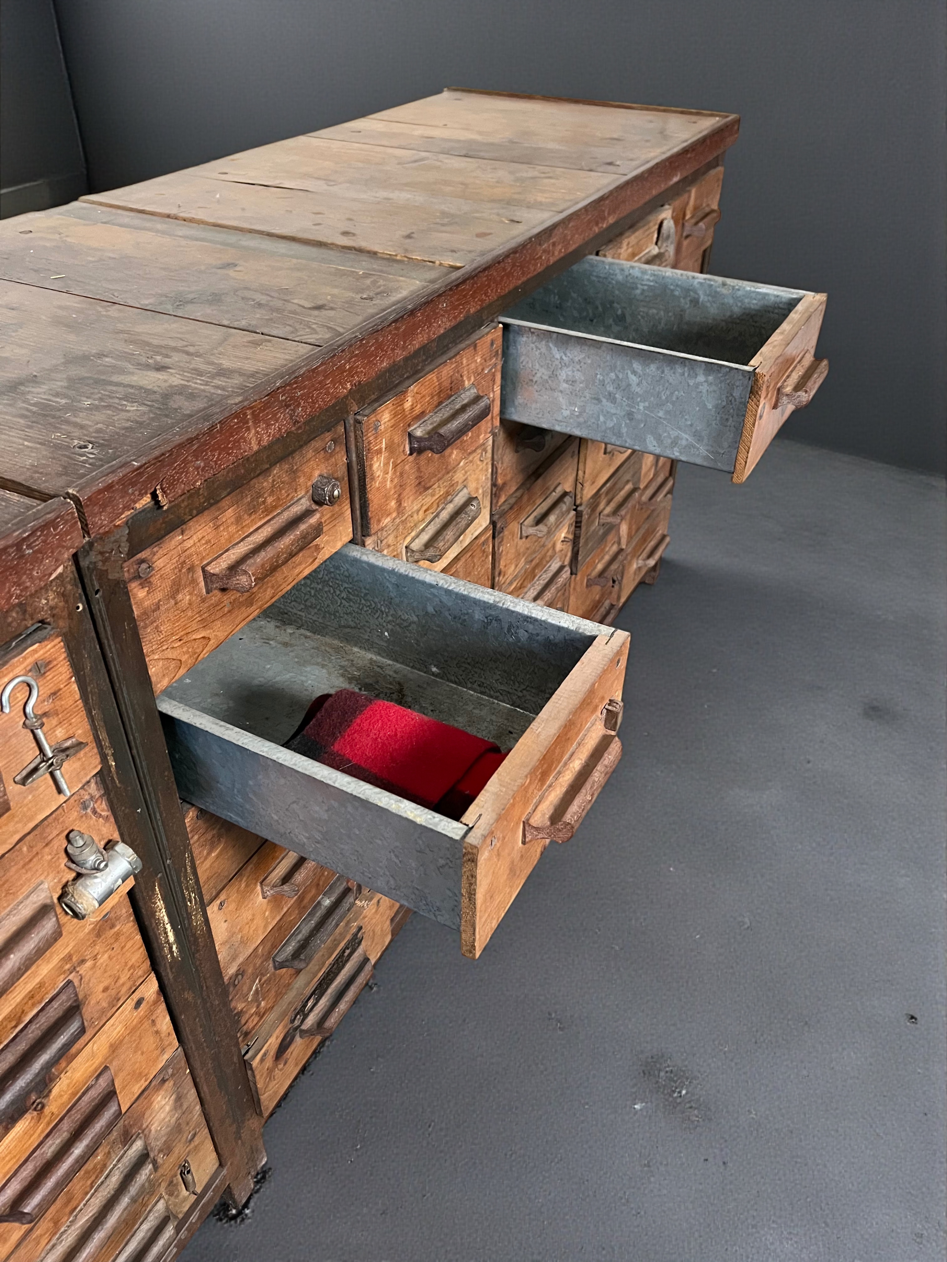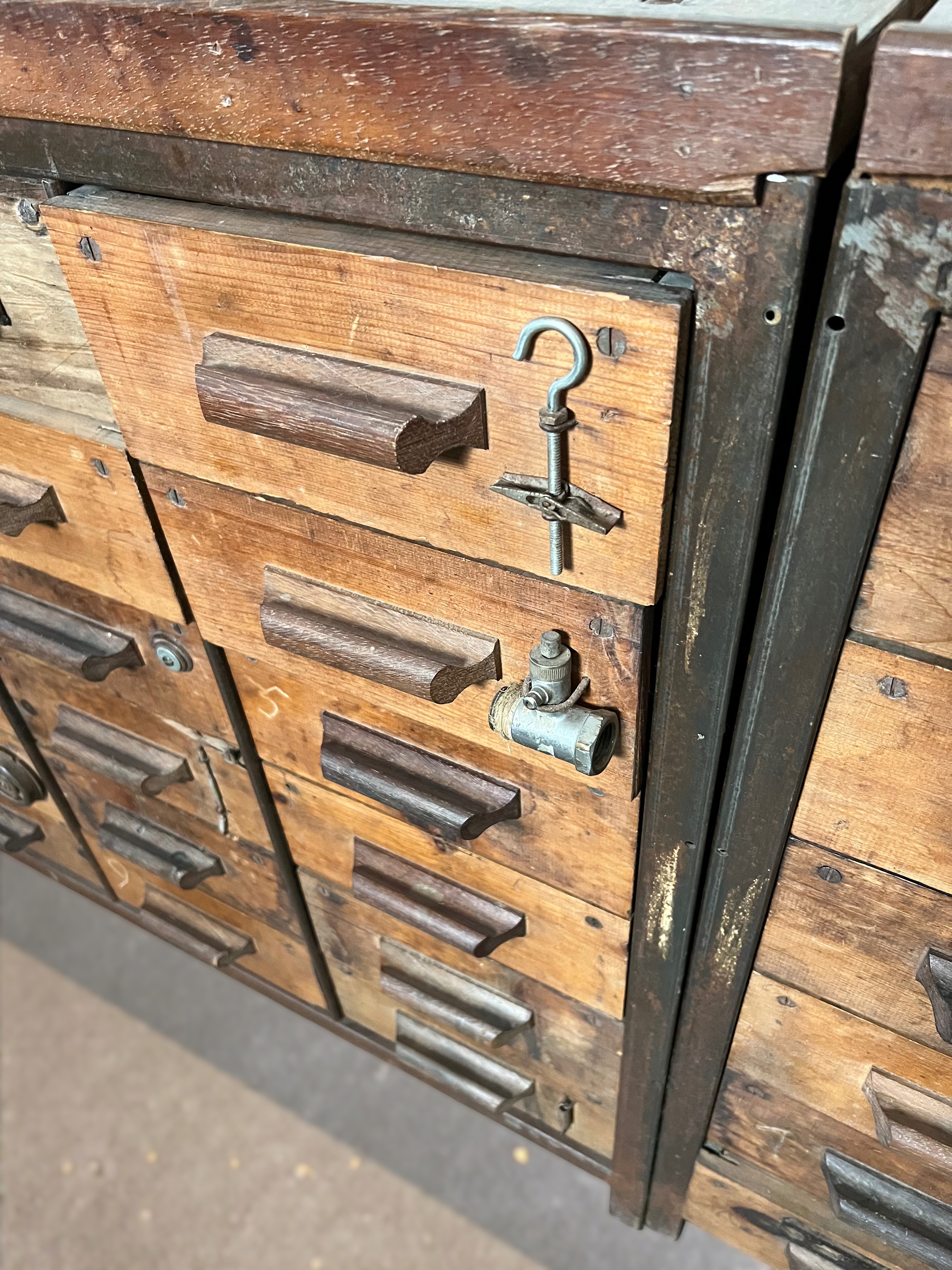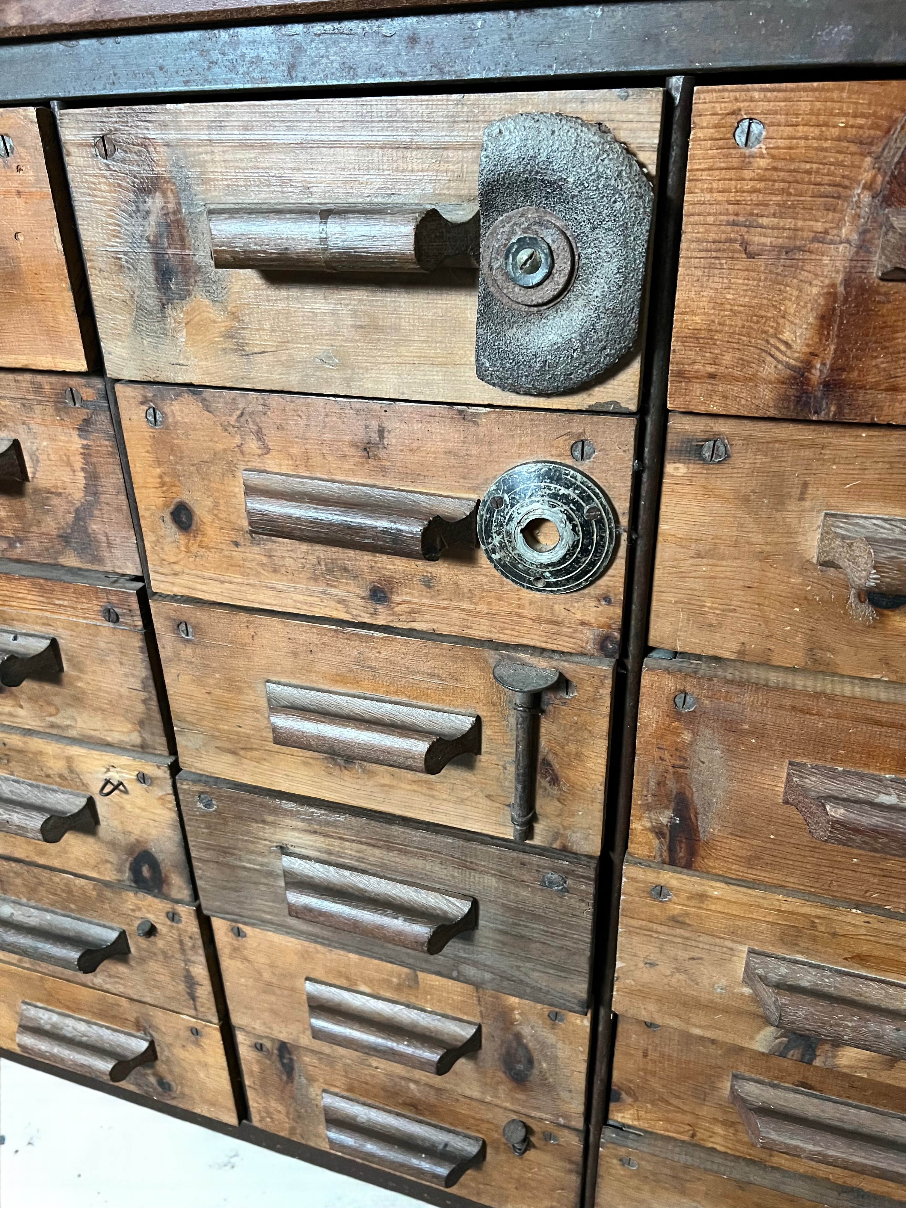 Imponente mobile da officina di design industriale, risalente alla prima metà del Novecento, realizzato in robusto legno massello e arricchito da inserti e maniglie. Dotato di numerosi cassetti, molti dei quali caratterizzati dagli originali elementi contenuti applicati sul fronte per facilitare la ricerca. Gli interni dei cassetti sono in lamiera zincata, ideali per la conservazione di attrezzi, documenti o oggetti di collezione, e garantiscono grande versatilità d’uso sia in ambienti privati che commerciali come studi creativi, laboratori o loft di carattere. Esemplare raro e scenografico, perfetto per chi ricerca pezzi unici dal sapore industriale autentico, capaci di fondersi armoniosamente anche in contesti contemporanei.