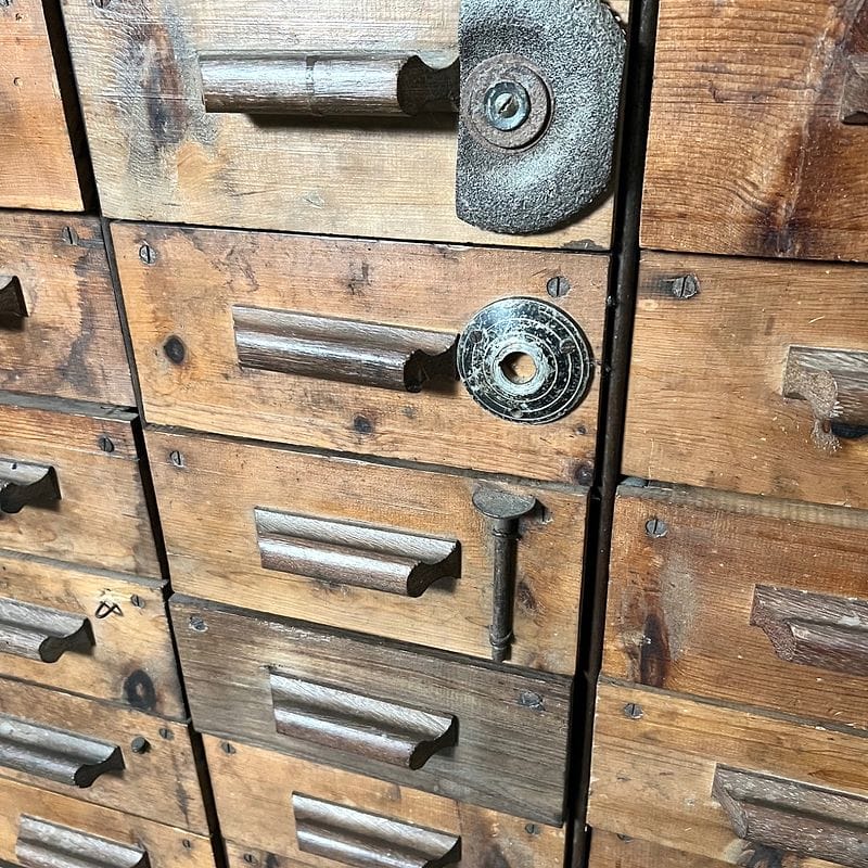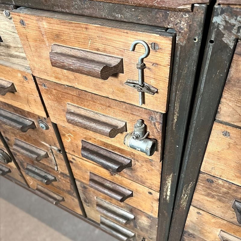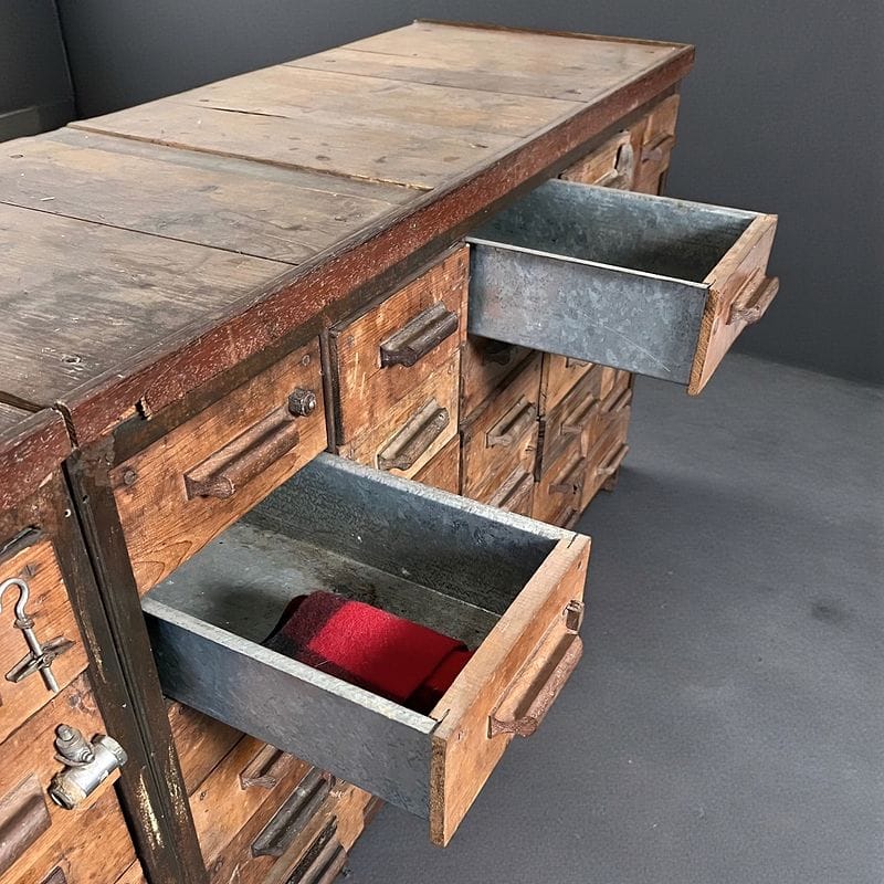 Imponente mobile da officina di design industriale, risalente alla prima metà del Novecento, realizzato in ferro, robusto legno massello, lamiera zincata ed arricchito da inserti e maniglie. Dotato di numerosi cassetti, molti dei quali caratterizzati dagli originali elementi contenuti applicati sul fronte per facilitare la ricerca. Gli interni dei cassetti sono in lamiera zincata, ideali per la conservazione di attrezzi, documenti o oggetti di collezione, e garantiscono grande versatilità d’uso sia in ambienti privati che commerciali come studi creativi, laboratori o loft di carattere. Esemplare raro e scenografico, perfetto per chi ricerca pezzi unici dal sapore industriale autentico, capaci di fondersi armoniosamente anche in contesti contemporanei.