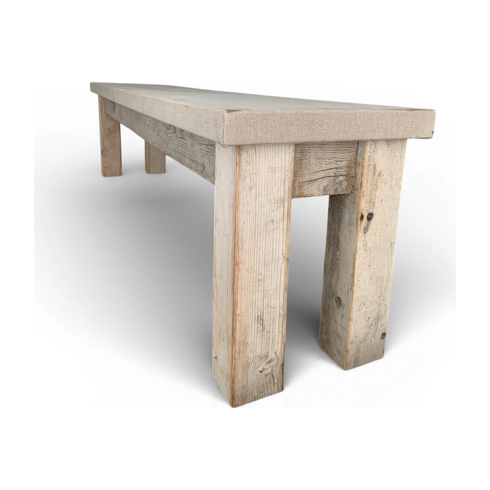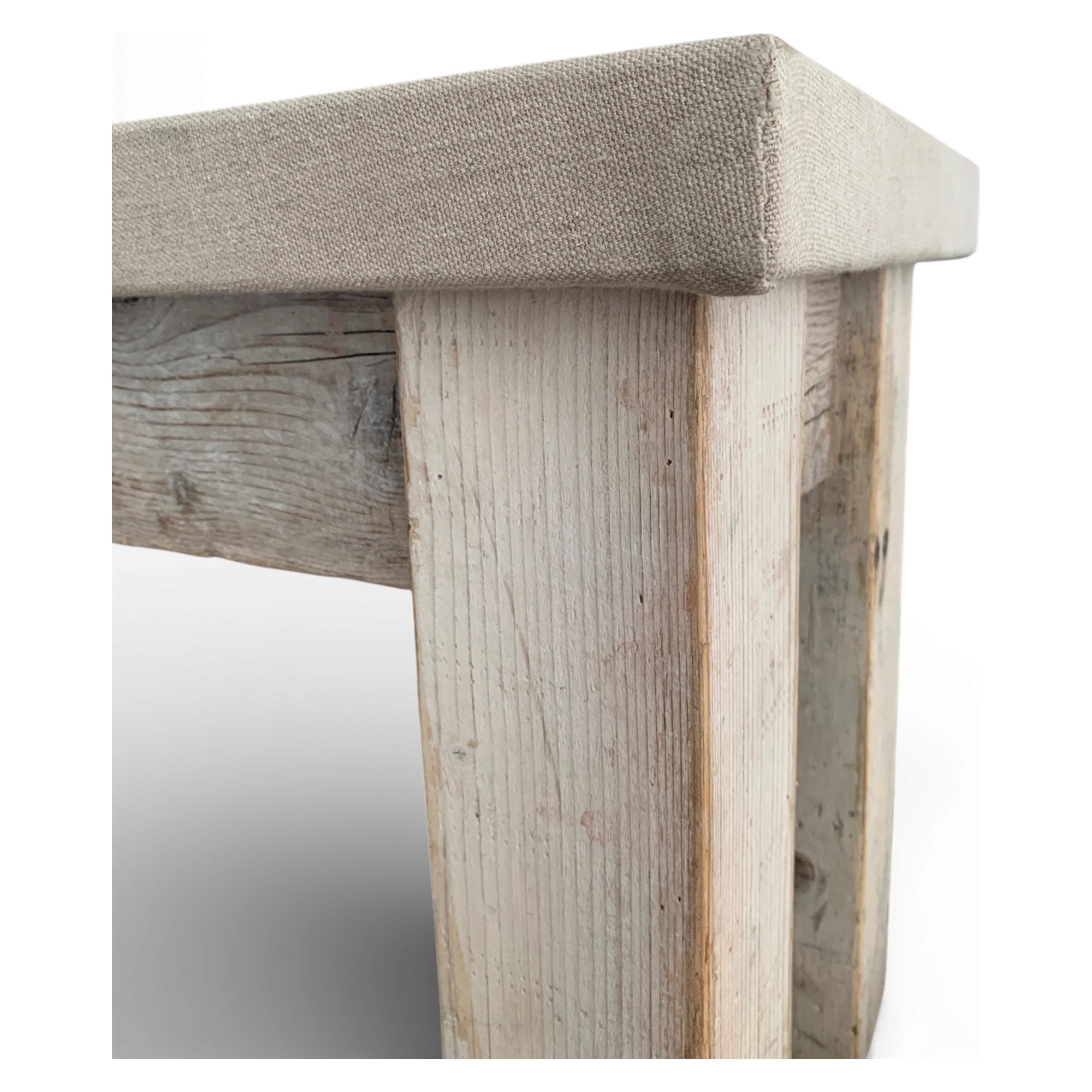 Questa panchetta rivestita in lino utilizza legno di recupero, probabilmente proveniente da travi antiche, mantenendo i nodi e le venature ben visibili. Il rivestimento in lino grezzo, teso senza cuciture appariscenti, richiama una tecnica artigianale rurale oggi sempre più rara. Interessante il contrasto tra la materia nobile e il carattere volutamente grezzo delle gambe e dell'intelaiatura: un accenno sottile alla cultura contadina del dopoguerra che privilegiava funzionalità e disponibilità dei materiali.