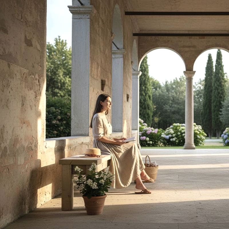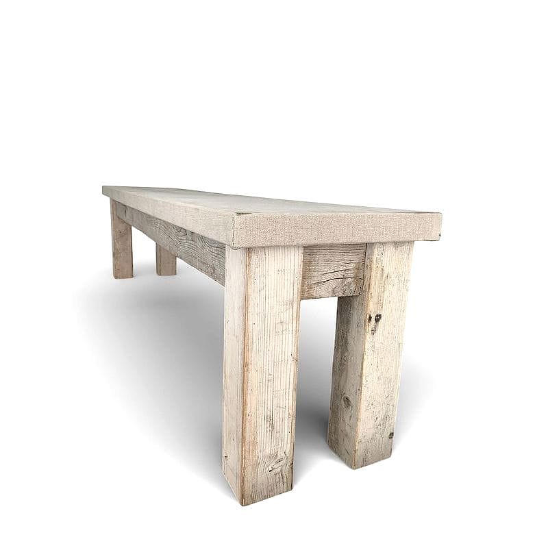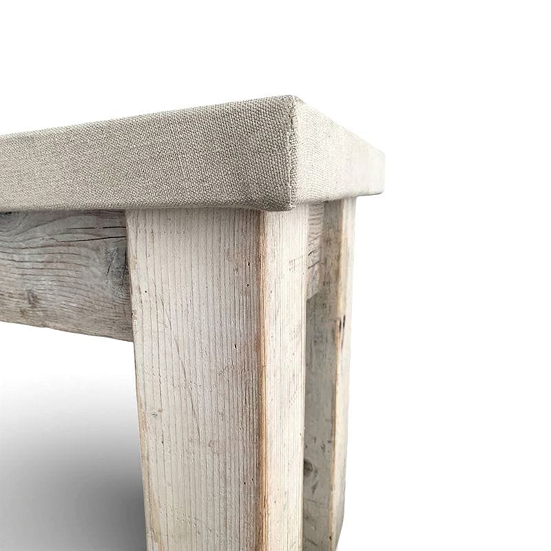 Questa panchetta rivestita in lino utilizza legno di recupero, proveniente da assi di larice antiche, mantenendo i nodi e le venature ben visibili. Il rivestimento in lino grezzo esalta il contrasto tra la materia nobile e il carattere volutamente grezzo delle gambe e dell'intelaiatura: un accenno sottile alla cultura contadina del dopoguerra che privilegiava funzionalità e disponibilità dei materiali.