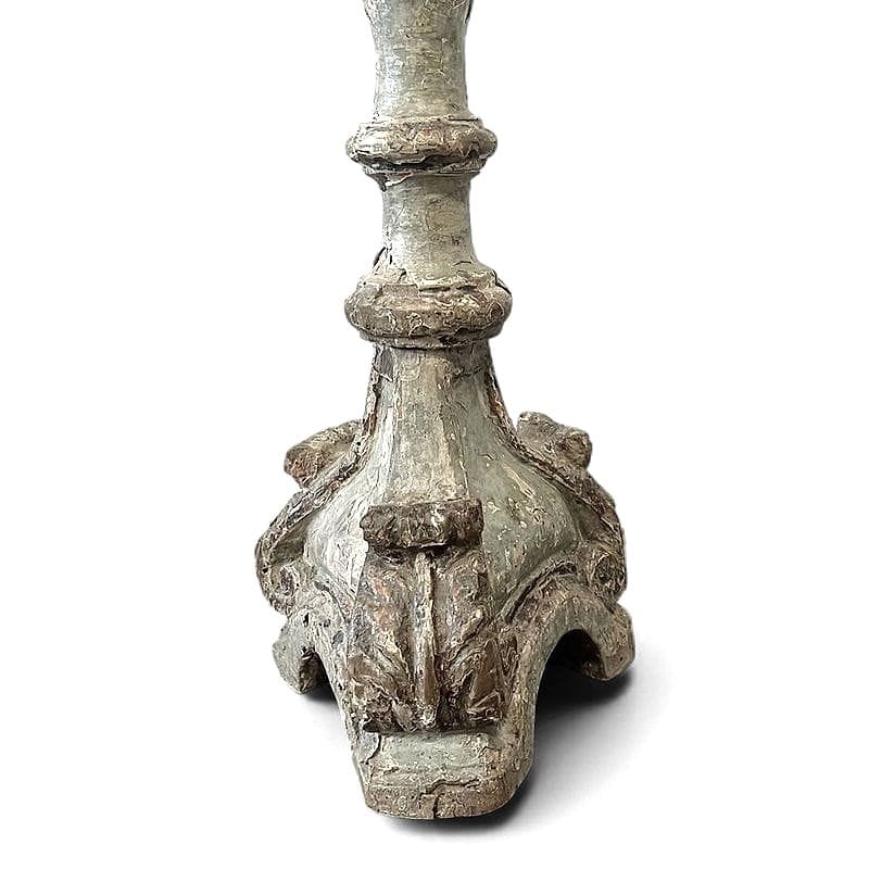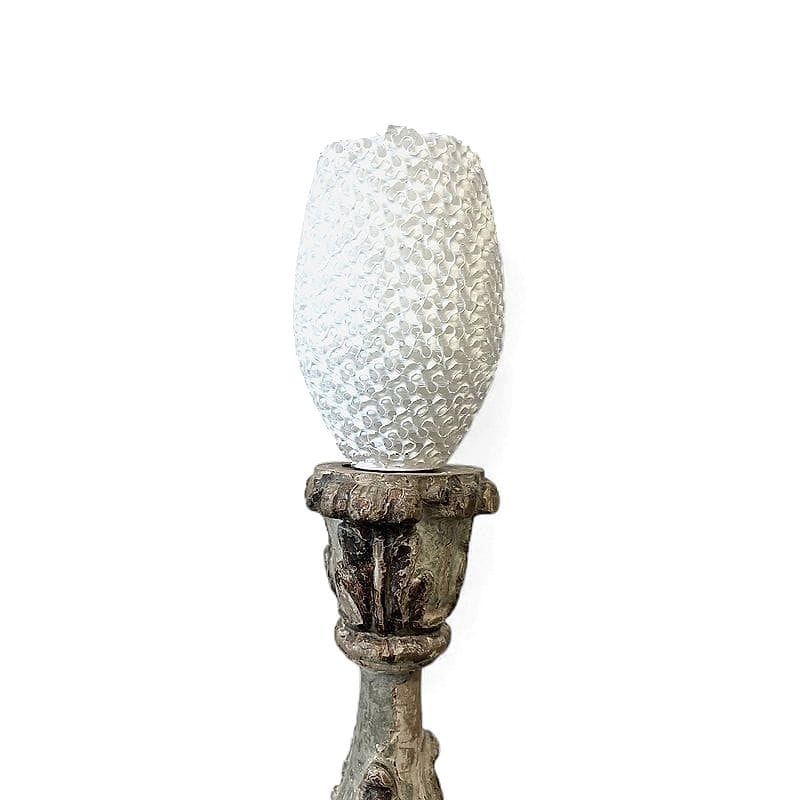 Questa piantana nasce dall'inedito accostamento tra una base barocca lignea e un paralume in PLA stampato. Un curioso mix assieme alla base, probabilmente nata come grande torciere ecclesiastico, porta ancora tracce di policromia settecentesca sotto le successive mani di pittura.