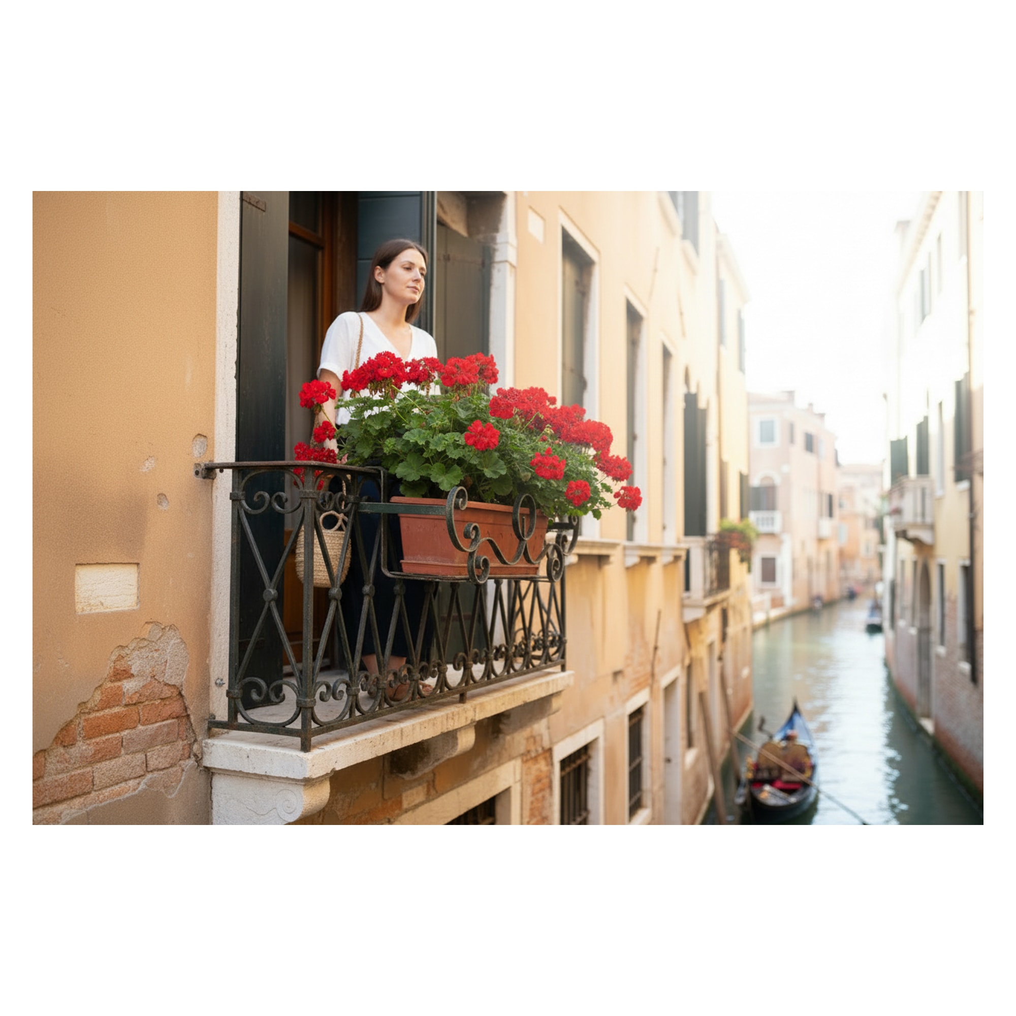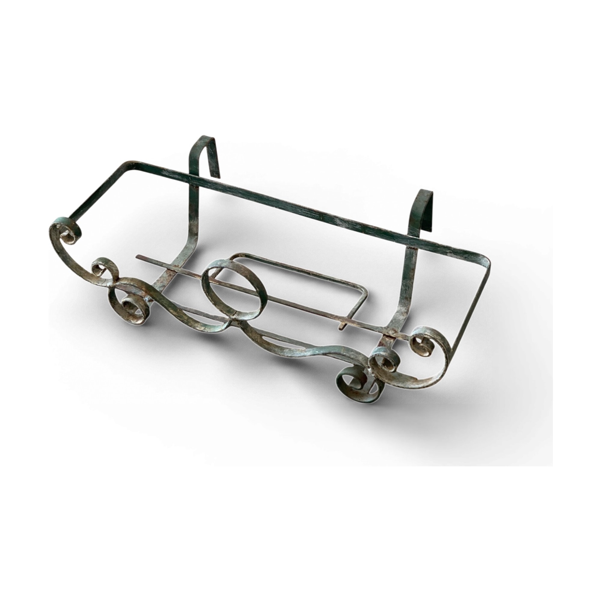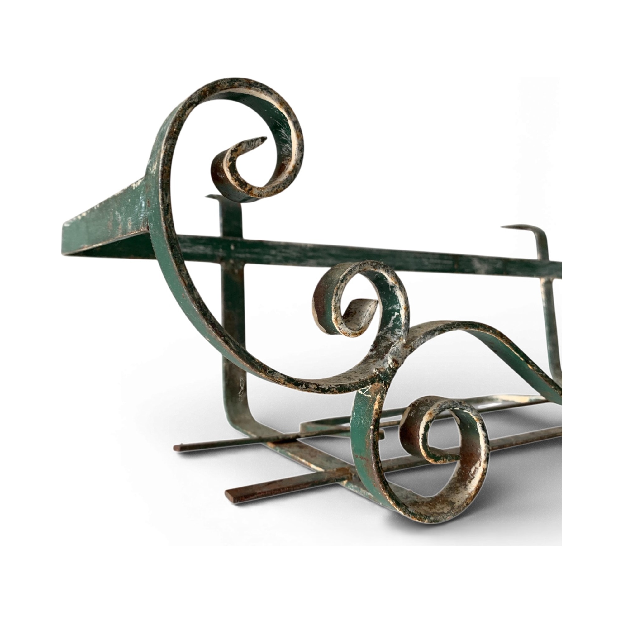 Porta vaso da balcone in ferro battuto, decorato con volute tipiche della tradizione veneziana. Il dettaglio curioso è la doppia verniciatura a strati, che rivela tracce di verde sottostante: segno tangibile dell’esposizione a intemperie lagunari. Perfetto testimone della quotidianità architettonica delle calli veneziane.