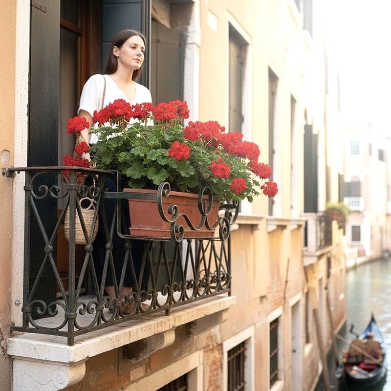 Porta vaso da balcone in ferro battuto, decorato con volute tipiche della tradizione veneziana. Perfetto testimone della quotidianità architettonica delle calli veneziane.