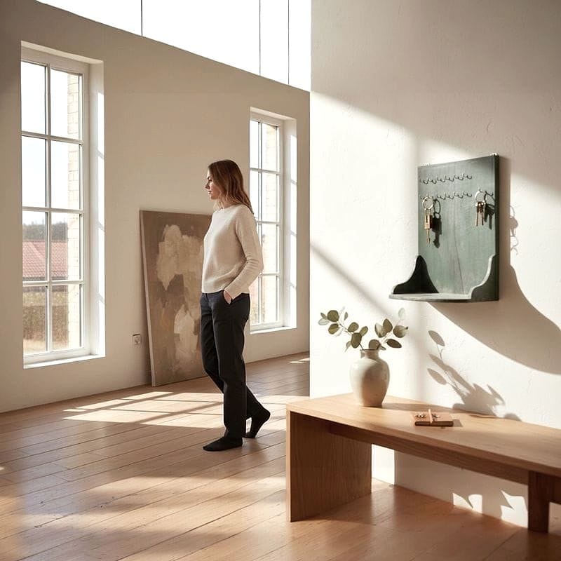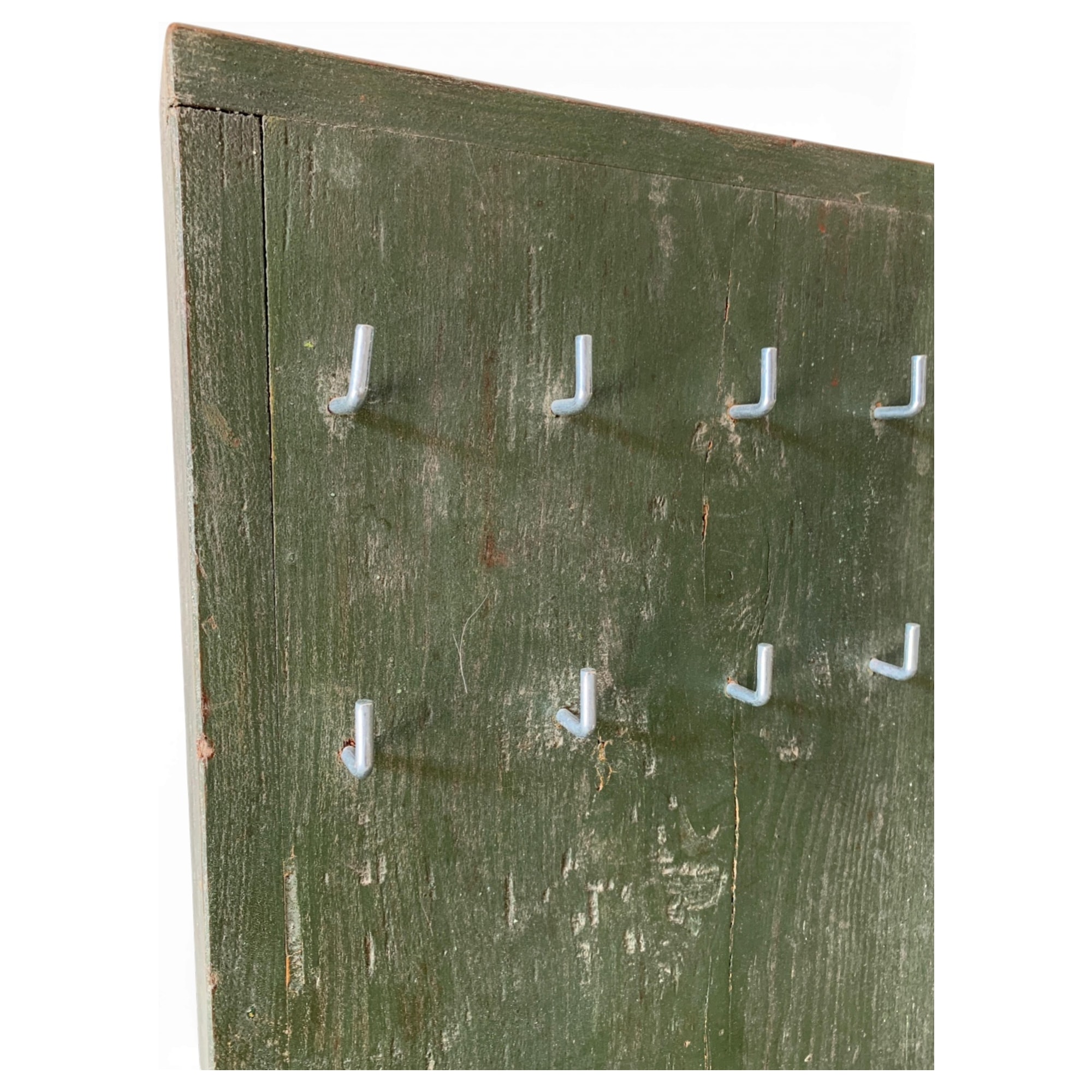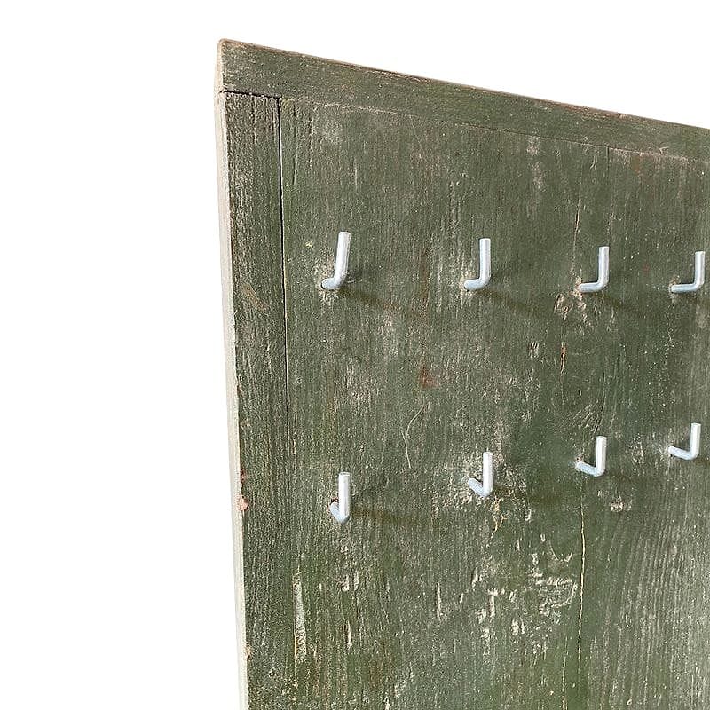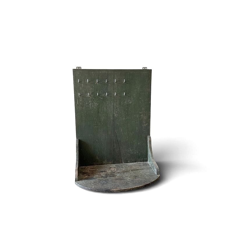 Questo portachiavi da muro rivela un'autentica patina verde data dal tempo, testimonianza di decenni di utilizzo quotidiano. Costruito in legno massello, conserva una fila ordinata di piccoli ganci in ferro, perfetti per custodire chiavi o oggetti minuti. Curioso il bordo scolpito ai lati, pensato originariamente per raccogliere lettere o altri effetti personali: una soluzione pratica e raffinata oggi tornata d’attualità nell'ingresso contemporaneo.