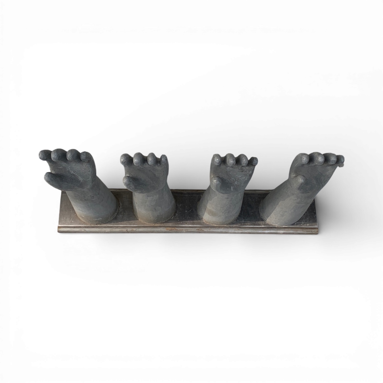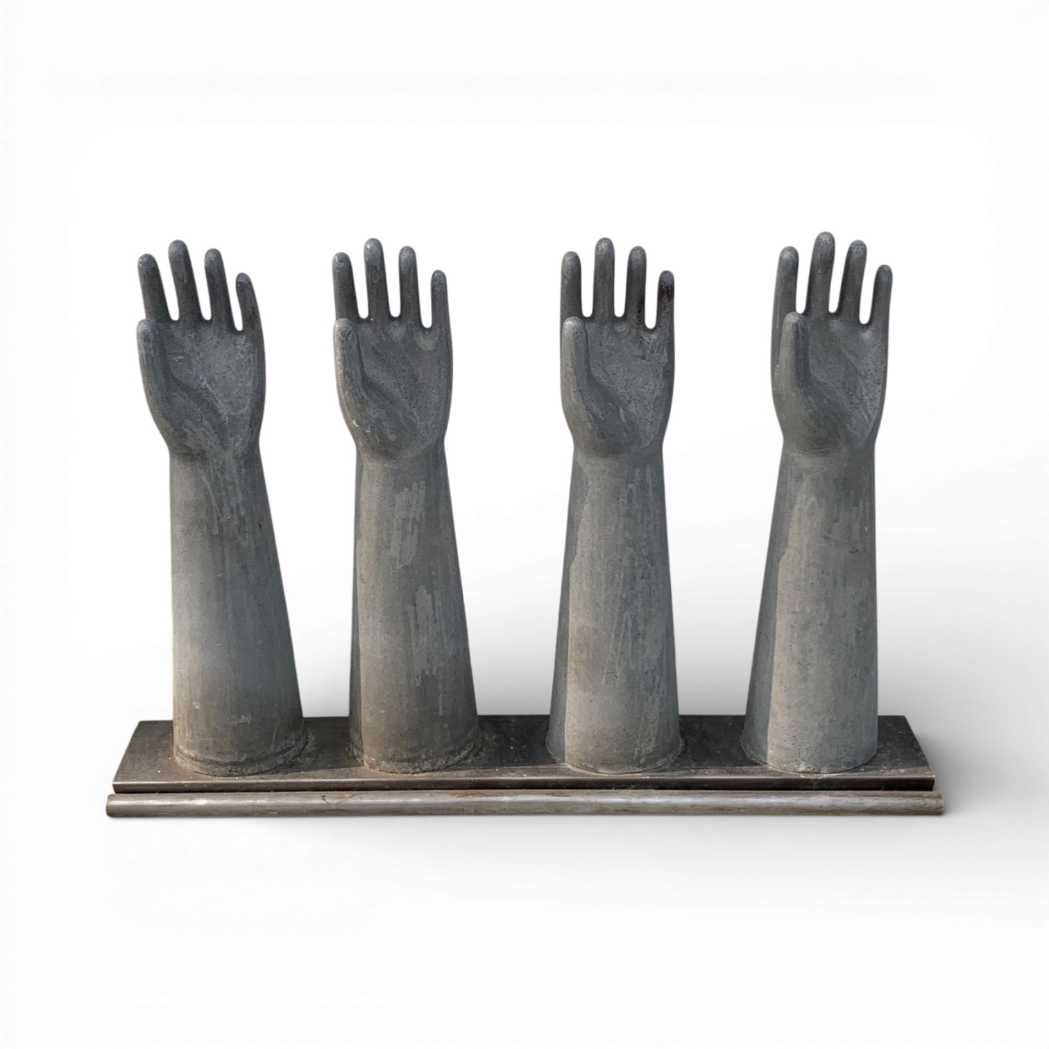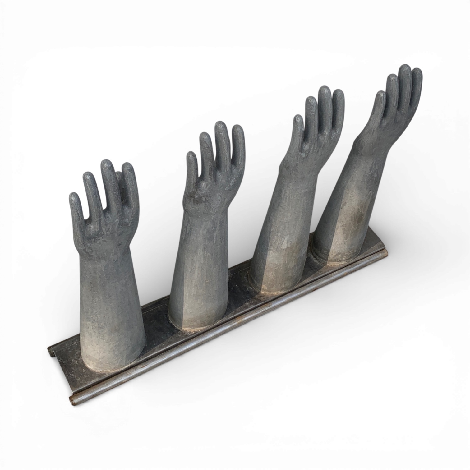 Raro supporto per la produzione di guanti in latice industriale, proveniente da un laboratorio manifatturiero anni '40. La base in metallo, volutamente spartana, ne rivela l’origine utilitaristica. Particolarità: le mani, tutte destrorse, venivano immerse in latice caldo per la realizzazione artigianale di guanti.