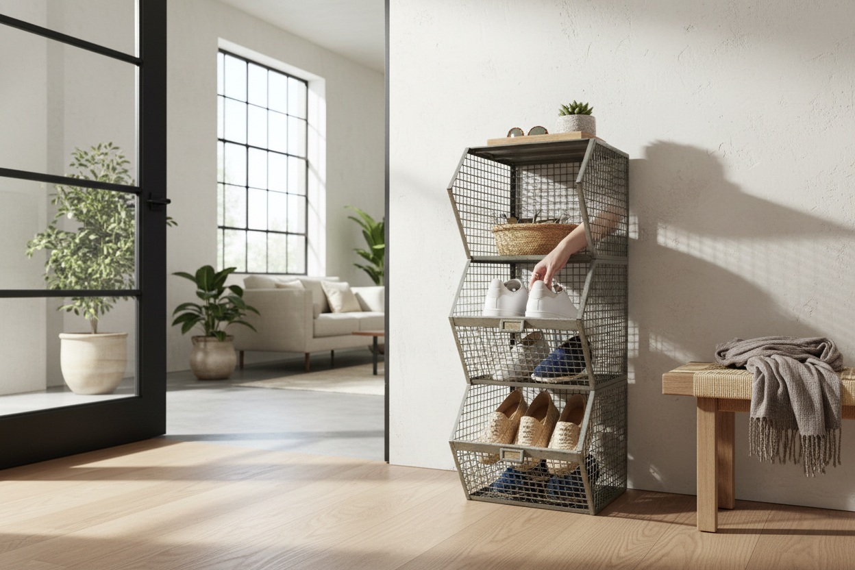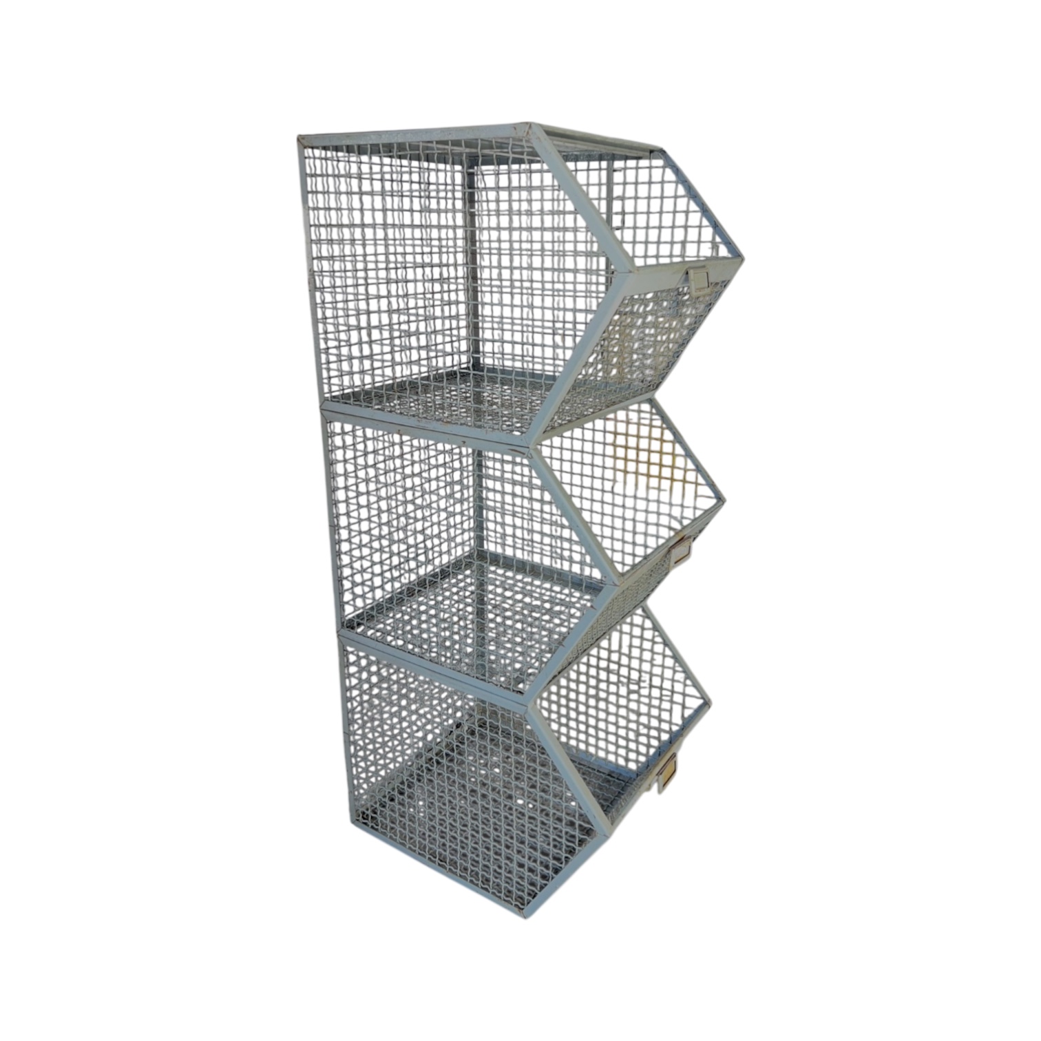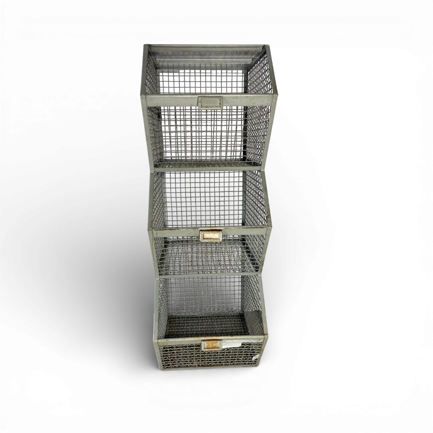 Questo raro sistema modulare era originariamente utilizzato nelle officine tessili come deposito per calzature e minuteria. La struttura a griglia offre massima aerazione ed è pensata per un rapido riconoscimento del contenuto, dettaglio ancora apprezzato da molti collezionisti di oggetti industriali originali. I portaetichette in ottone, spesso dimenticati o rimossi nel tempo, sono qui ancora presenti e leggibili.