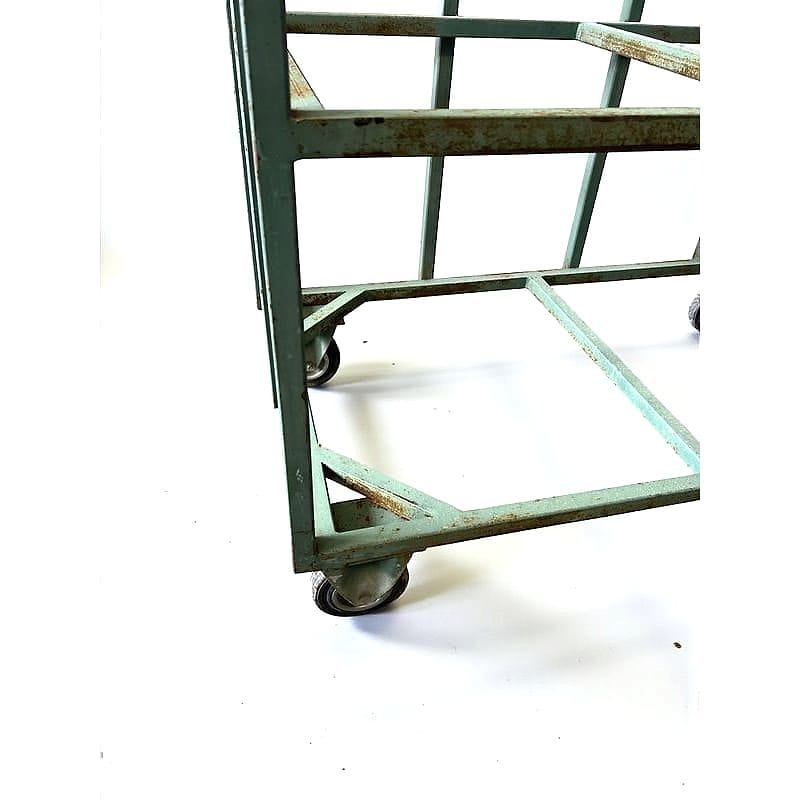 Questo robusto scaffale industriale anni '50, verniciato in un verde polveroso tipico dei vecchi laboratori, poggia su ruote che raccontano una storia di praticità operaia. Con l'inserimento (eventualmente possibile su richiesta) di ripiani in legno o altro materiale può diventare una libreria iconica all'interno di uno spazio commerciale o di un loft con richiami allo stile industriale.