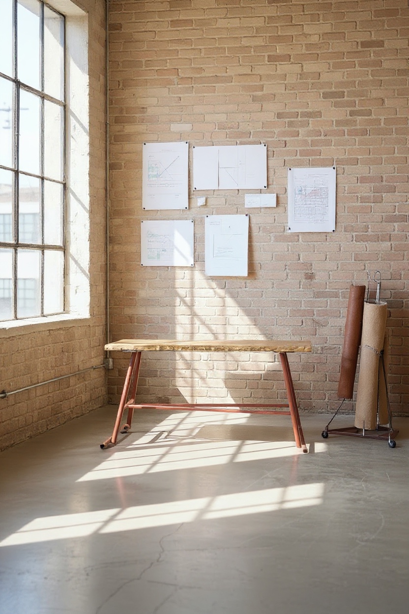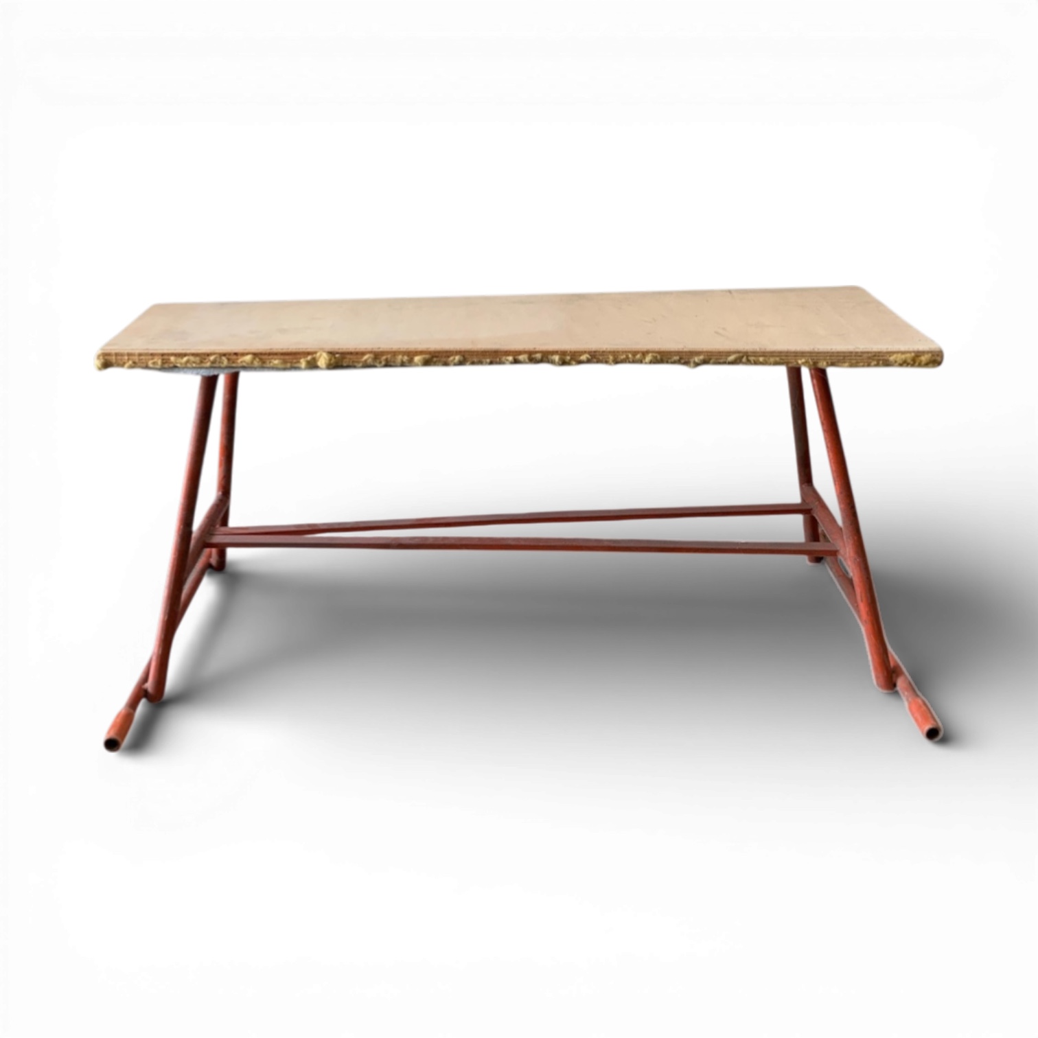Curiosa scrivania industriale dove il bordo grezzo del piano in compensato conserva volutamente segni di produzione e usura originale. La struttura in tubolare metallico, ancora con tracce di vernice rossa, richiama i vecchi banchi da officina: ogni graffio racconta di un utilizzo operativo piuttosto che d’esibizione. Un dettaglio curioso: i terminali dei tubi sono privi di tappi, lasciando visibile l’interno, dettaglio spesso rimosso nei restauri.