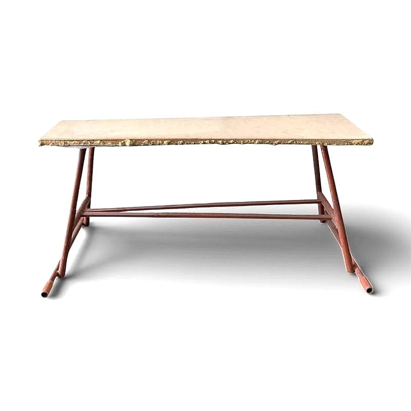 - Piano in compensato multistrato bordi grezzi; struttura in tubolare metallico verniciato rosso (originale a polvere o nitrocellulosa)