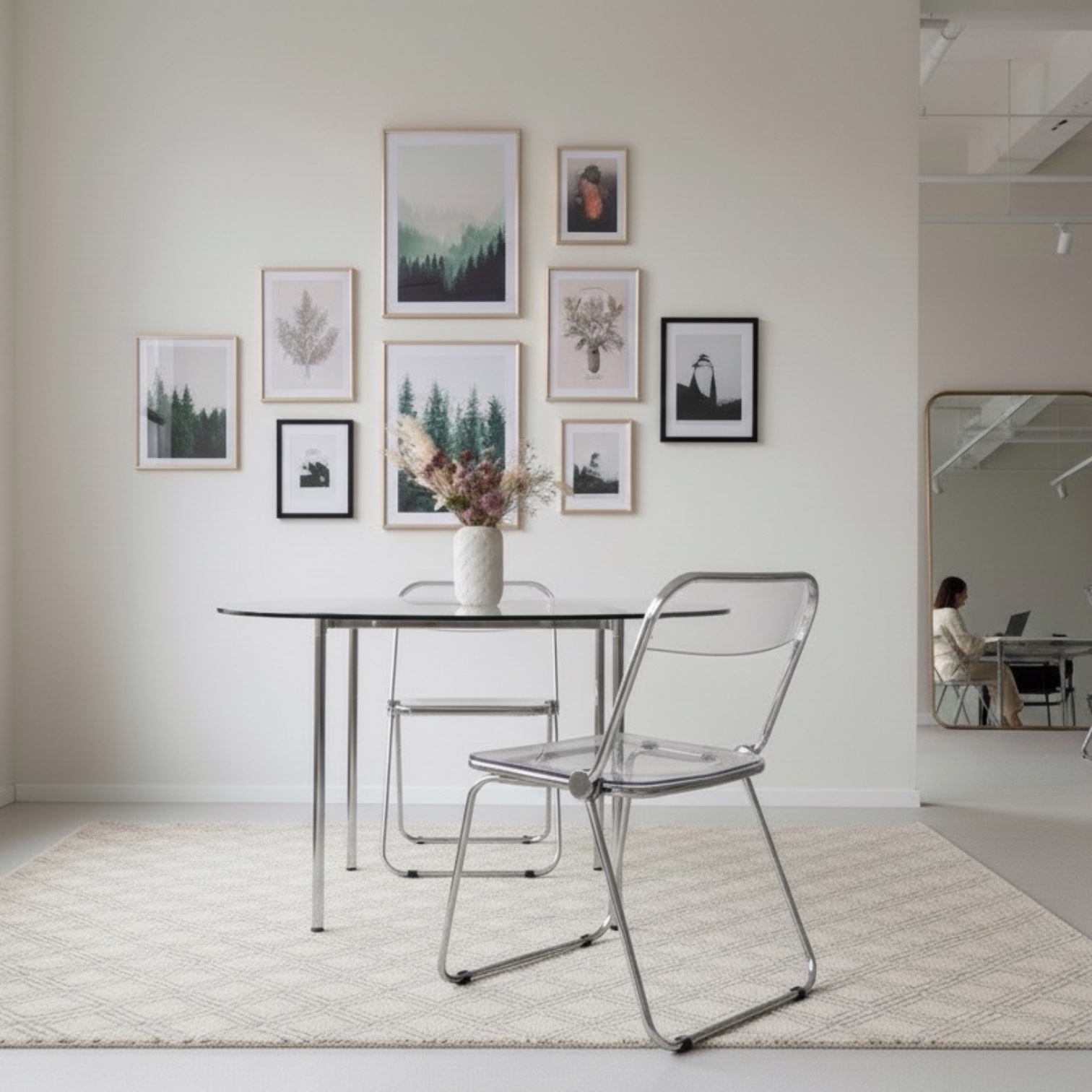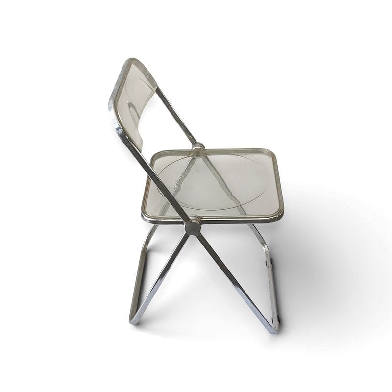 Icona pop degli anni '70, questa sedia pieghevole esibisce una sorprendente trasparenza grazie al plexiglass sagomato a caldo. Un dettaglio rilevante: le giunture metalliche a vista sono pensate per un’apertura silenziosa e fluida, ispirate alle meccaniche delle cabine telefoniche di quel periodo. Una sedia simile fu spesso utilizzata negli ambienti domestici minimal e negli studi di design europei.