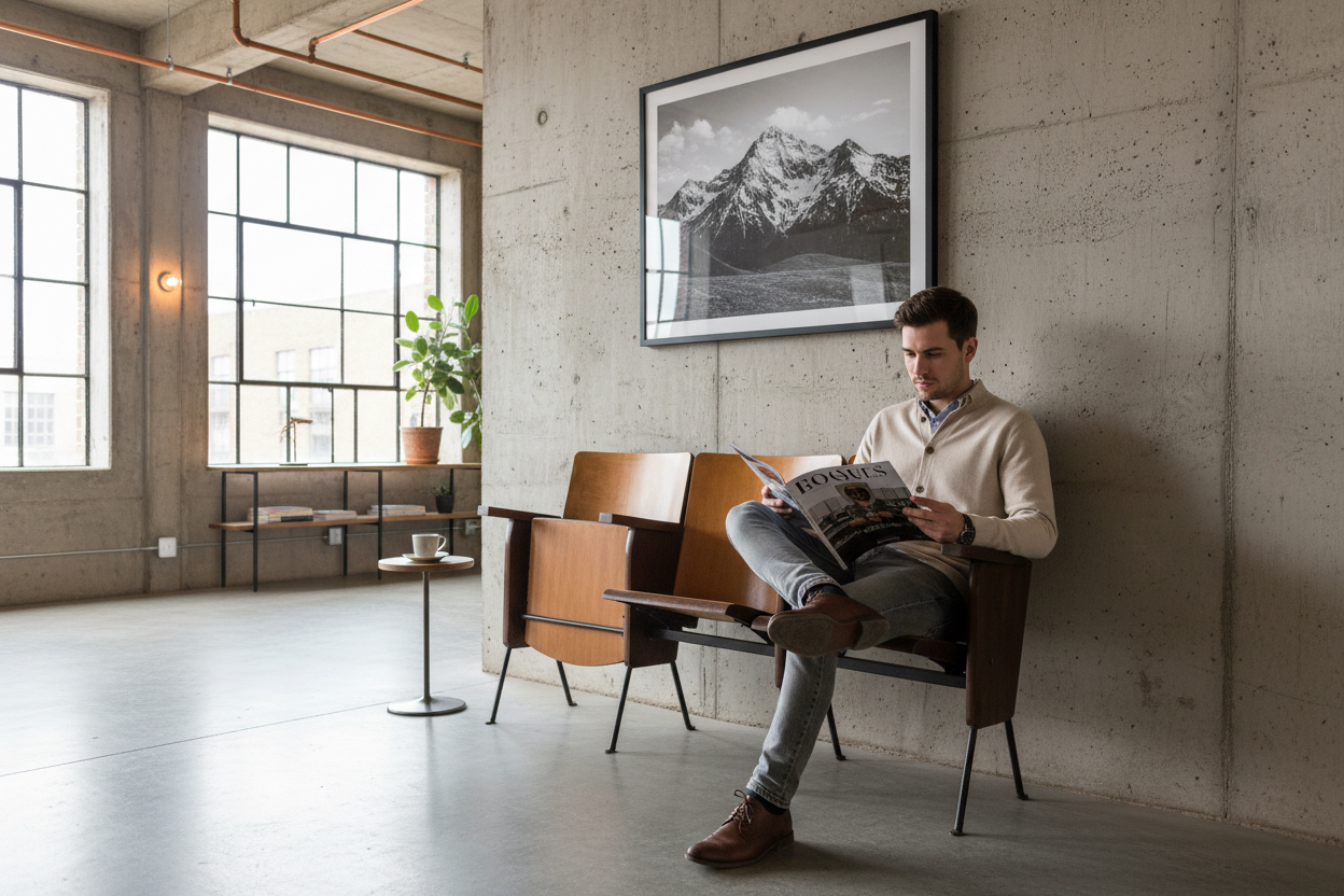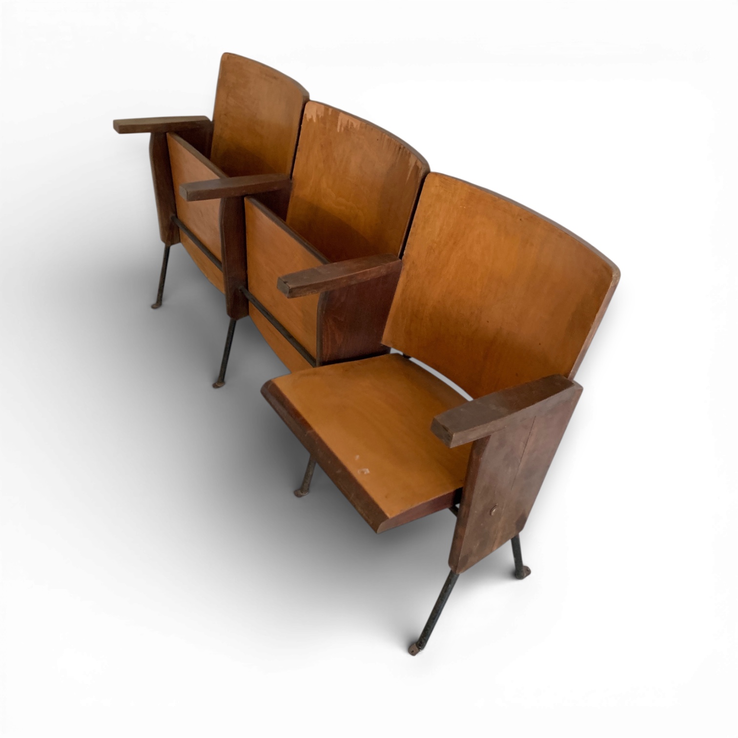 Questa seduta tripla proveniva da una platea di teatro della metà del secolo scorso, dove ogni movimento era dettato da un ingegnoso sistema a molla nascosto sotto la seduta. Il legno curvato, ottenuto tramite vapore, era la risposta industriale dell’epoca alla necessità di grande resistenza in spazi pubblici. I piccoli fori sui piedini rivelano la sua precedente installazione fissa a terra, un dettaglio che racconta silenziose sere d’inizio spettacolo.