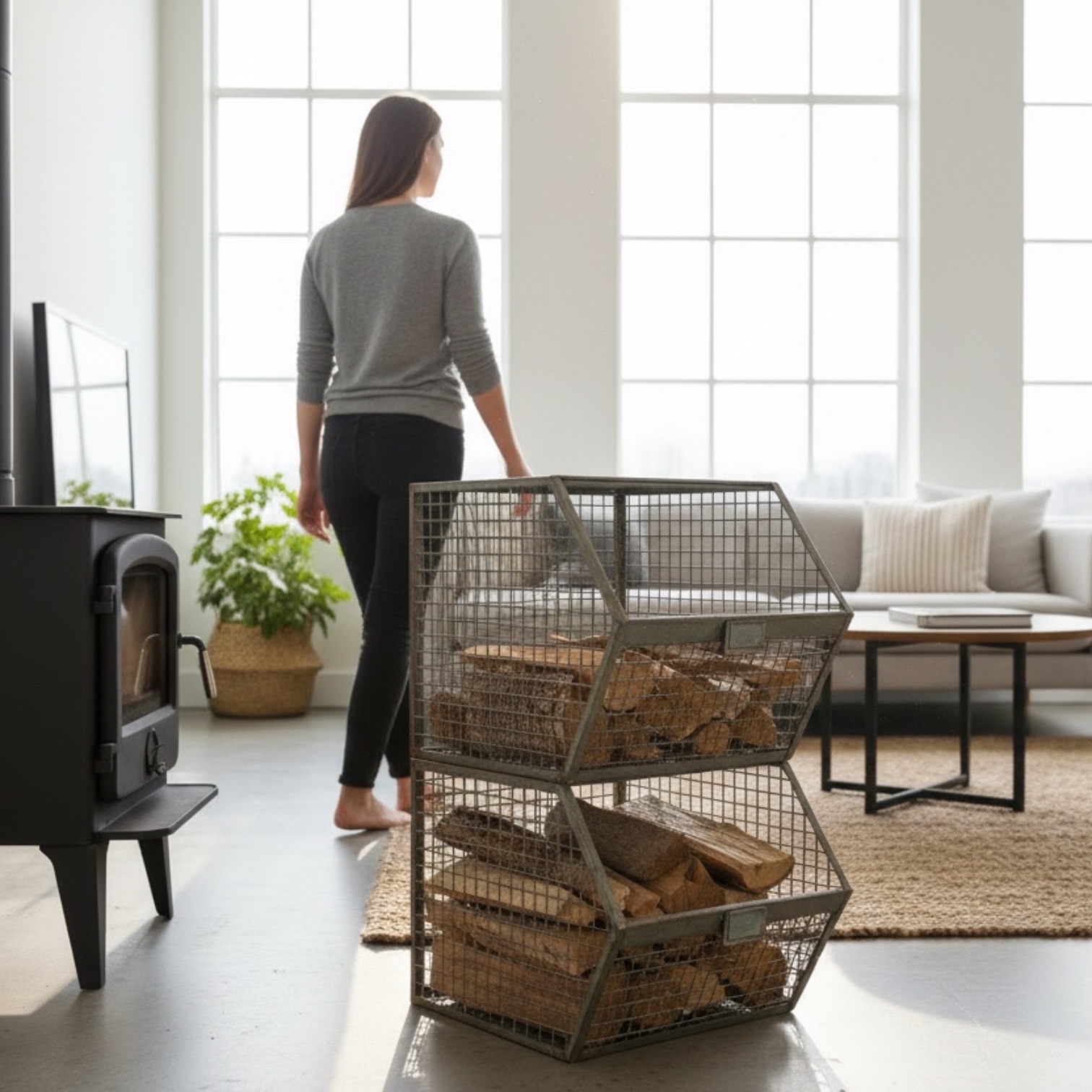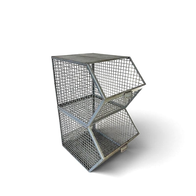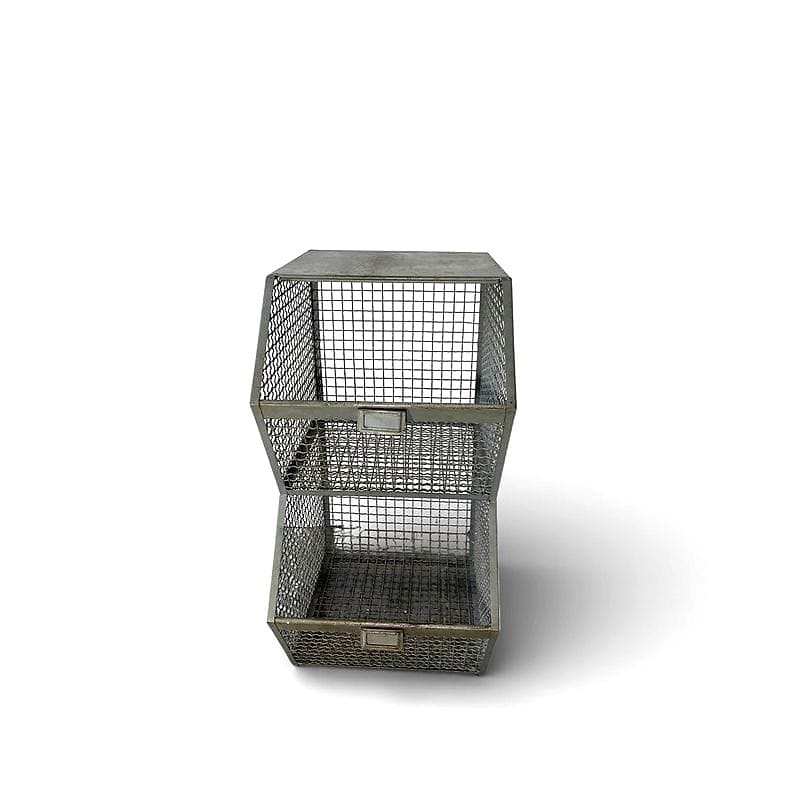 Queste ceste modulari in rete venivano originariamente utilizzate nei magazzini tessili del Nord Italia come soluzioni impilabili per la rapida identificazione e ventilazione della merce. La presenza di piccoli porta-etichetta sottolinea la loro provenienza industriale autentica.