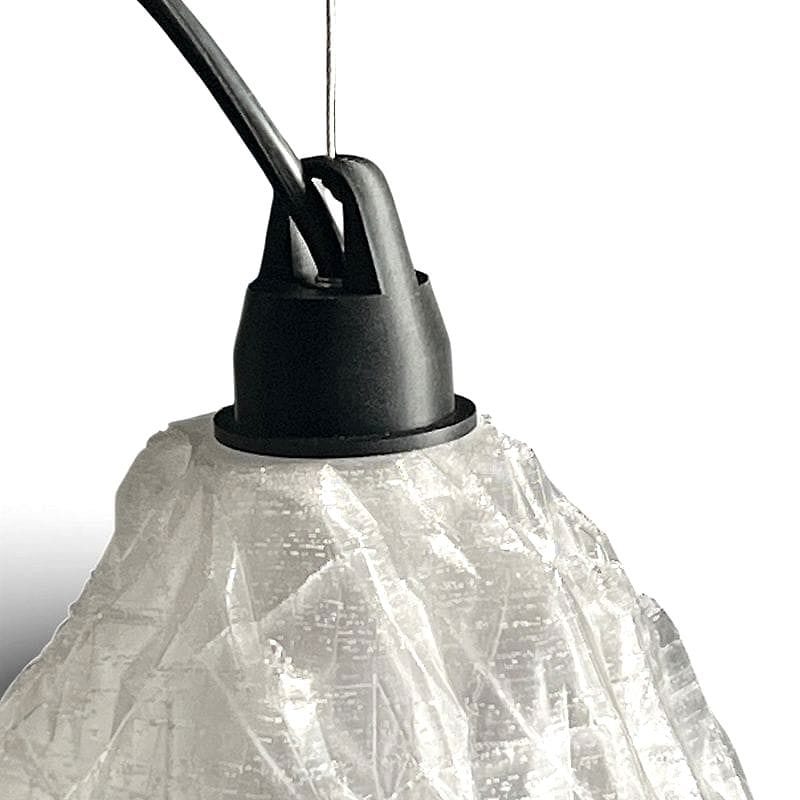 Il diffusore in PET presenta una scansione tridimensionale ispirata al ghiaccio cristallizzato, ottenuto tramite una stampa a strati molto fitta su modello digitale. Il dettaglio curioso sono i microsegni lasciati dalle lavorazioni additive, che accentuano l’effetto glaciale alla luce. Sorprende la leggerezza, quasi eterea, di una struttura che da lontano potrebbe sembrare vetro inciso.